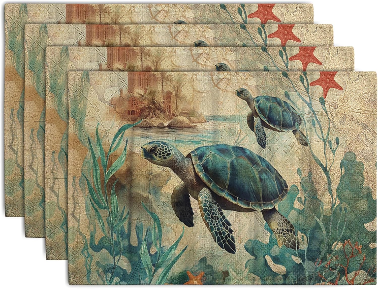 Sea Turtle Placemats Set of 4 Summer Beach Seasonal Linen Table Mats 12x18 Inch Vintage Ocean Animal Heat Resistant Washable Non-Slip Place Mats for Party Kitchen Dining Decoration