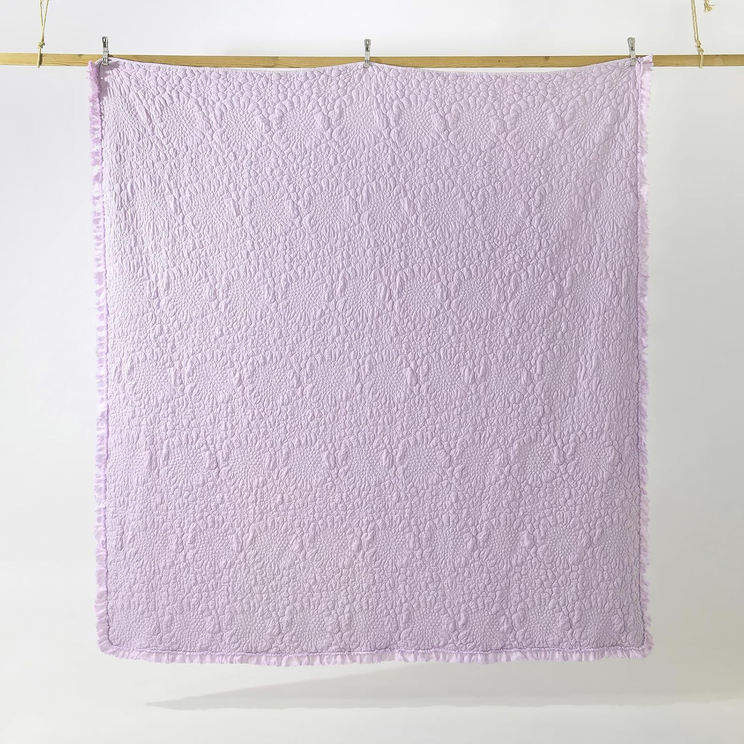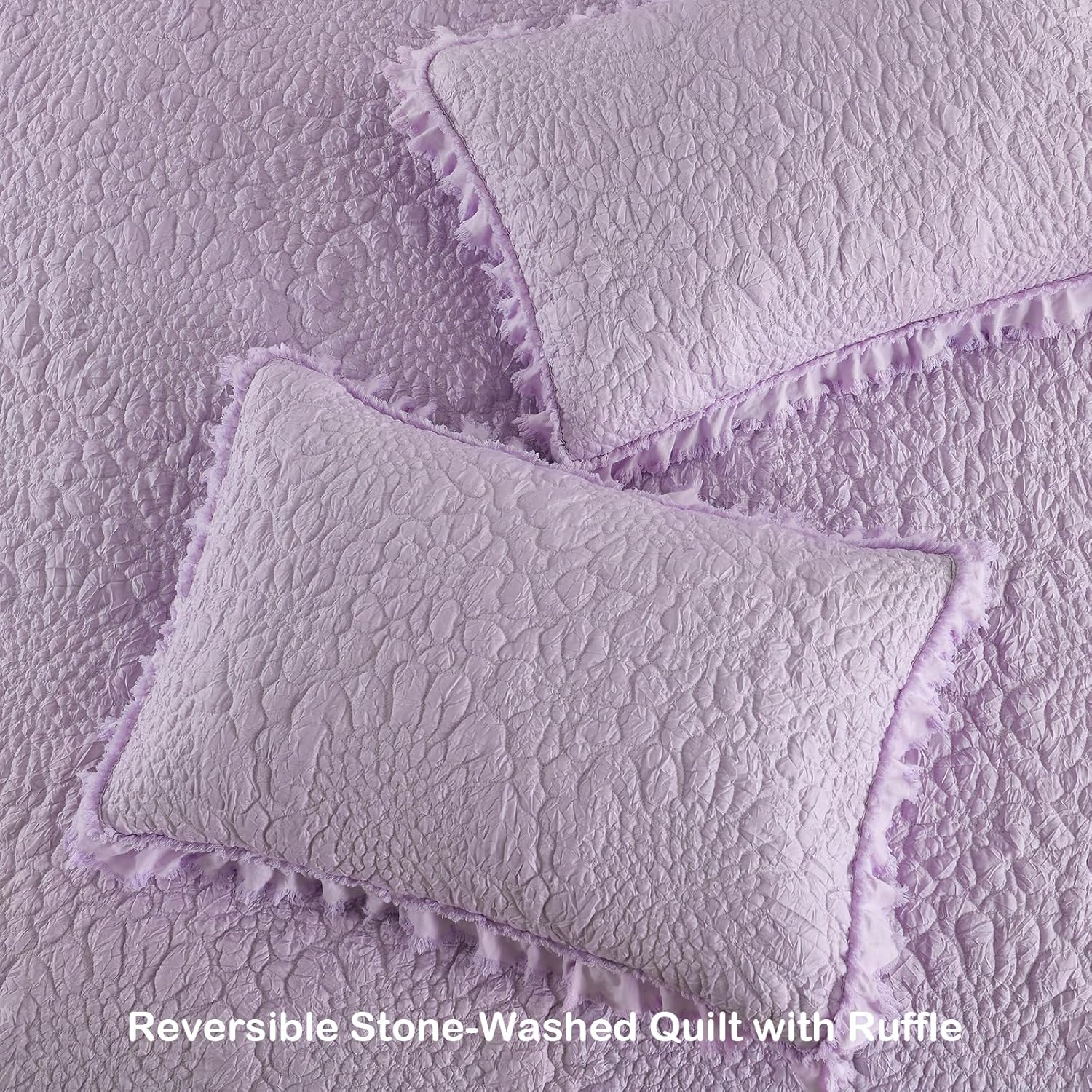 HORIMOTE HOME Lavender Ruffled Quilt King Size, Stone-Washed Microfiber Lightweight Crinkled Farmhouse Rustic Shabby Chic Bedding Set, 3 Pieces Reversible Bedspread with Pillow Shams for All Season
