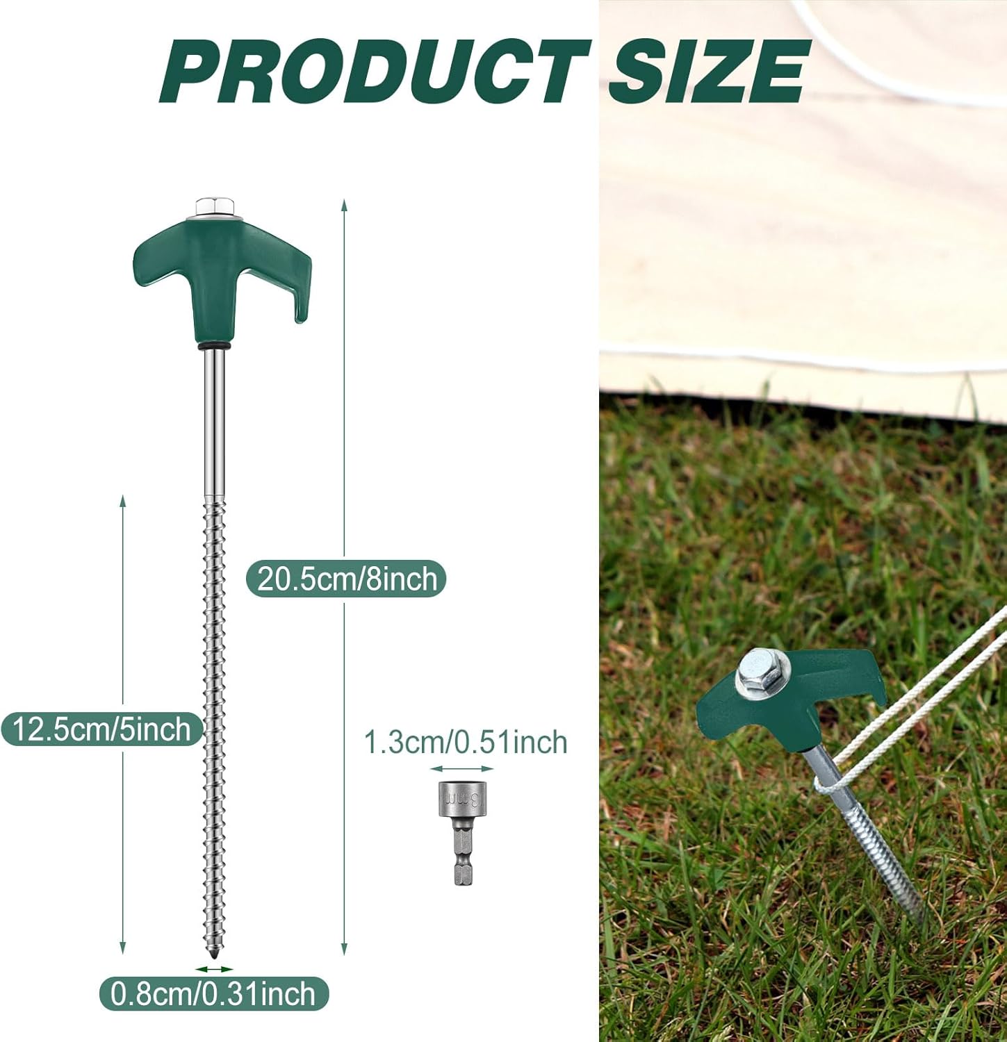 - Sufficient Quantity: you will receive 10 pieces of metal tent stakes and 1 piece of 0.51 inch diameter hex head driver, enough quantity to meet your applying needs and replacement needs; The stakes are approx. 8 inch/ 20.5 cm long, the thread is approx. 5 inch/ 12.5 cm long and approx. 0.31 inch/ 0.8 cm in diameter