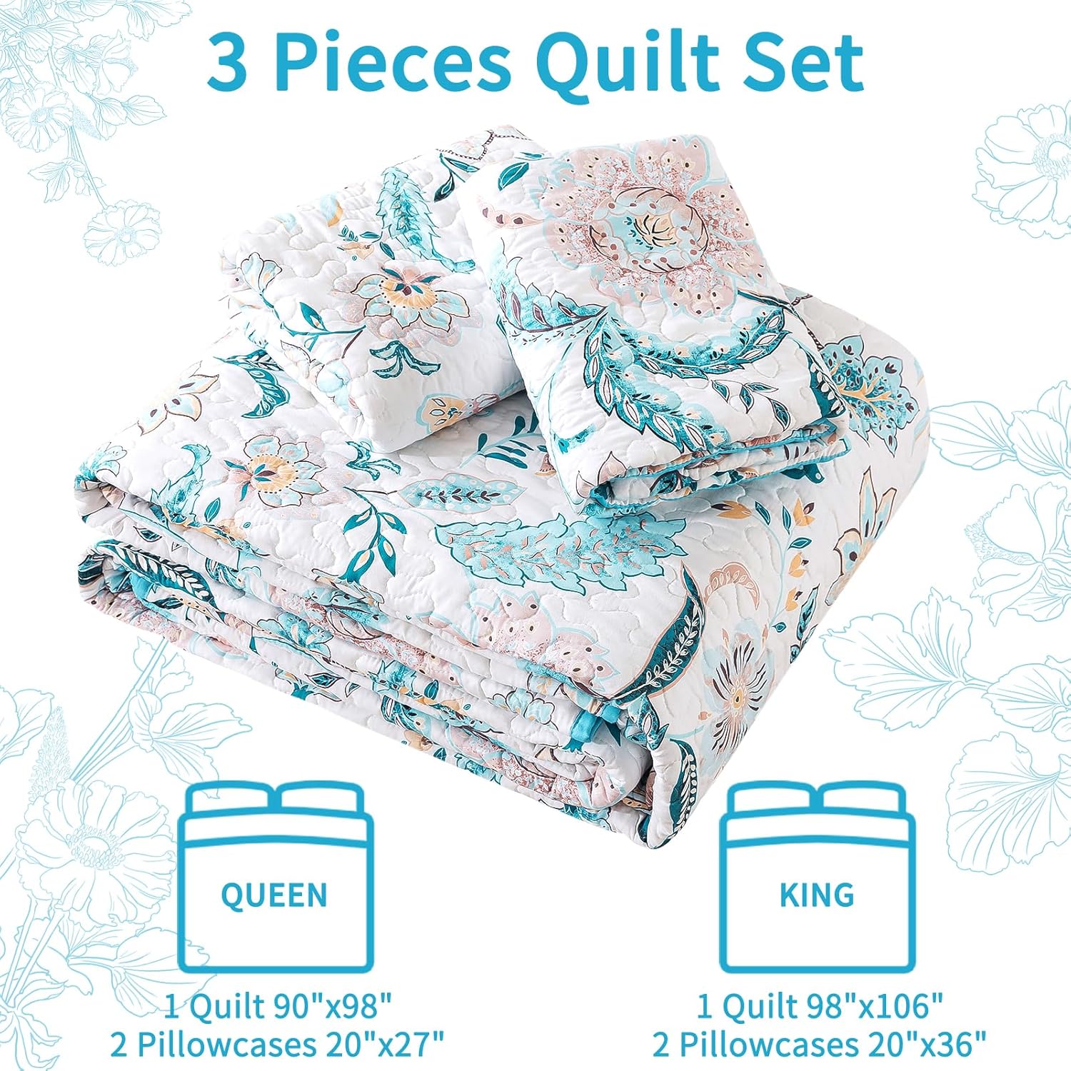 VAPUTAR Garden Queen Size Bedspread for Adults - Floral Quilt Queen Size Bedding Set (90 x 98 inch) with 2 Pillow Shams - Lightweight Reversible Coverlet Quilt for Bedroom, 3 Pieces