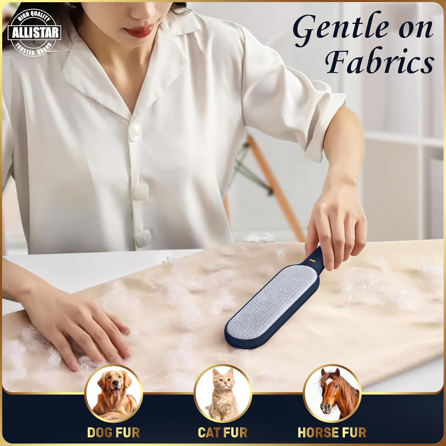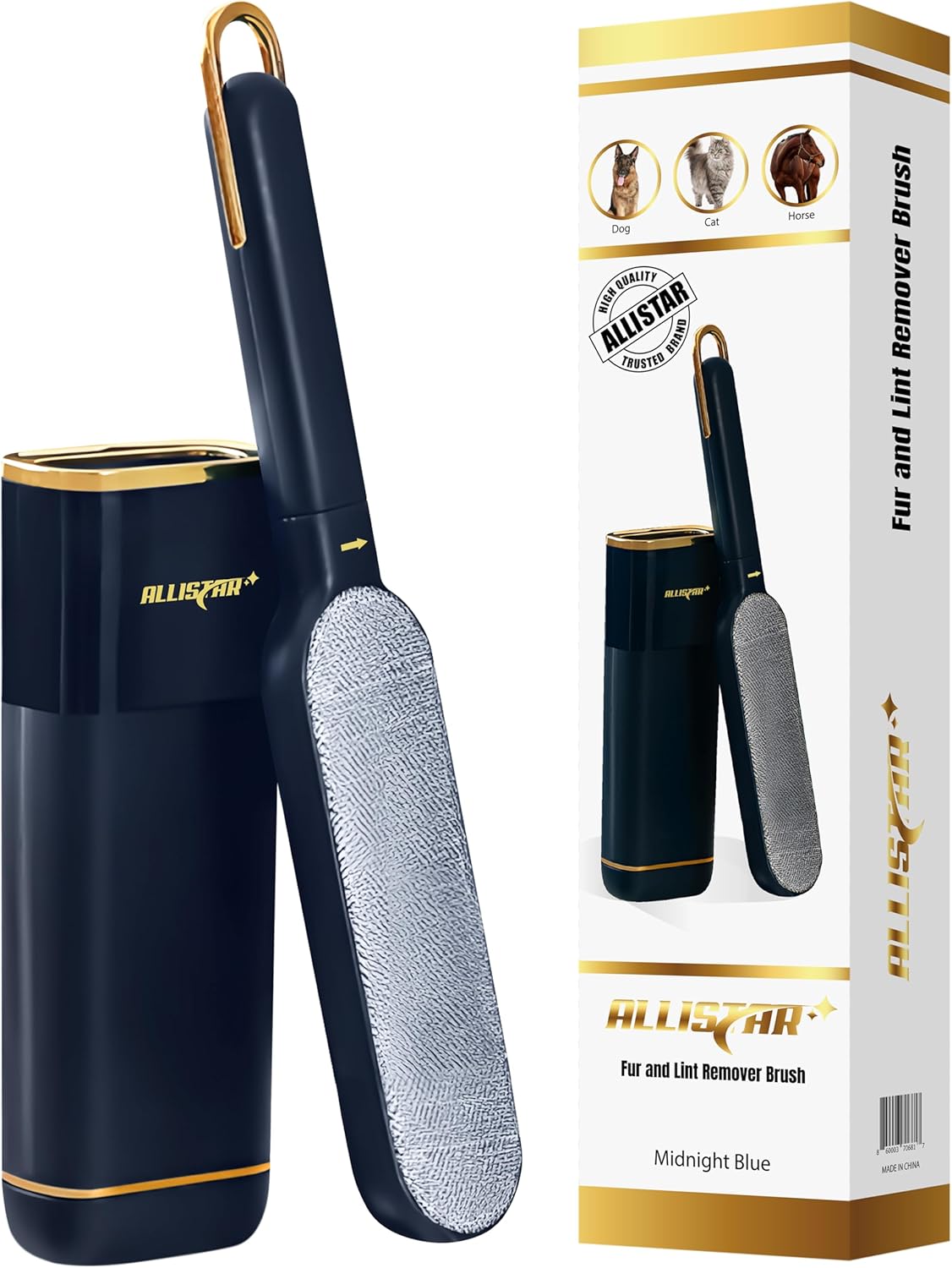 - DOUBLE SIDED ACTION - Larger sized brush allows for faster removal of unwanted pet fur and lint; The electrostatic design is gentle enough on delicate fabrics but strong enough to tackle tough cleaning jobs. ALLISTARβs lightweight design can go anywhere you go and has a handle that can be suspended on a hook for a great storage space saver.