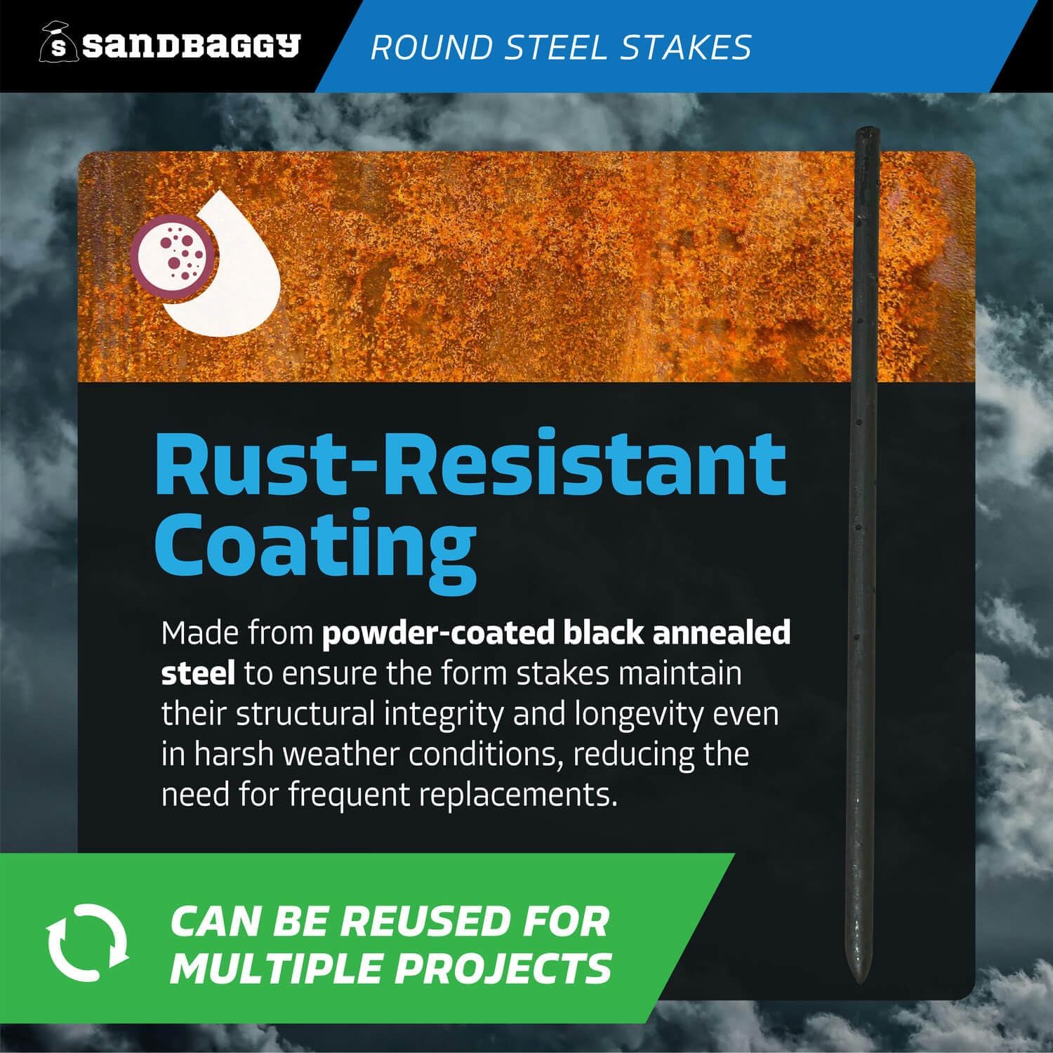 - RUST RESISTANT COATING: Made from powder-coated black annealed steel to ensure the form stakes maintain their structural integrity and longevity even in harsh weather conditions, reducing the need for frequent replacements.