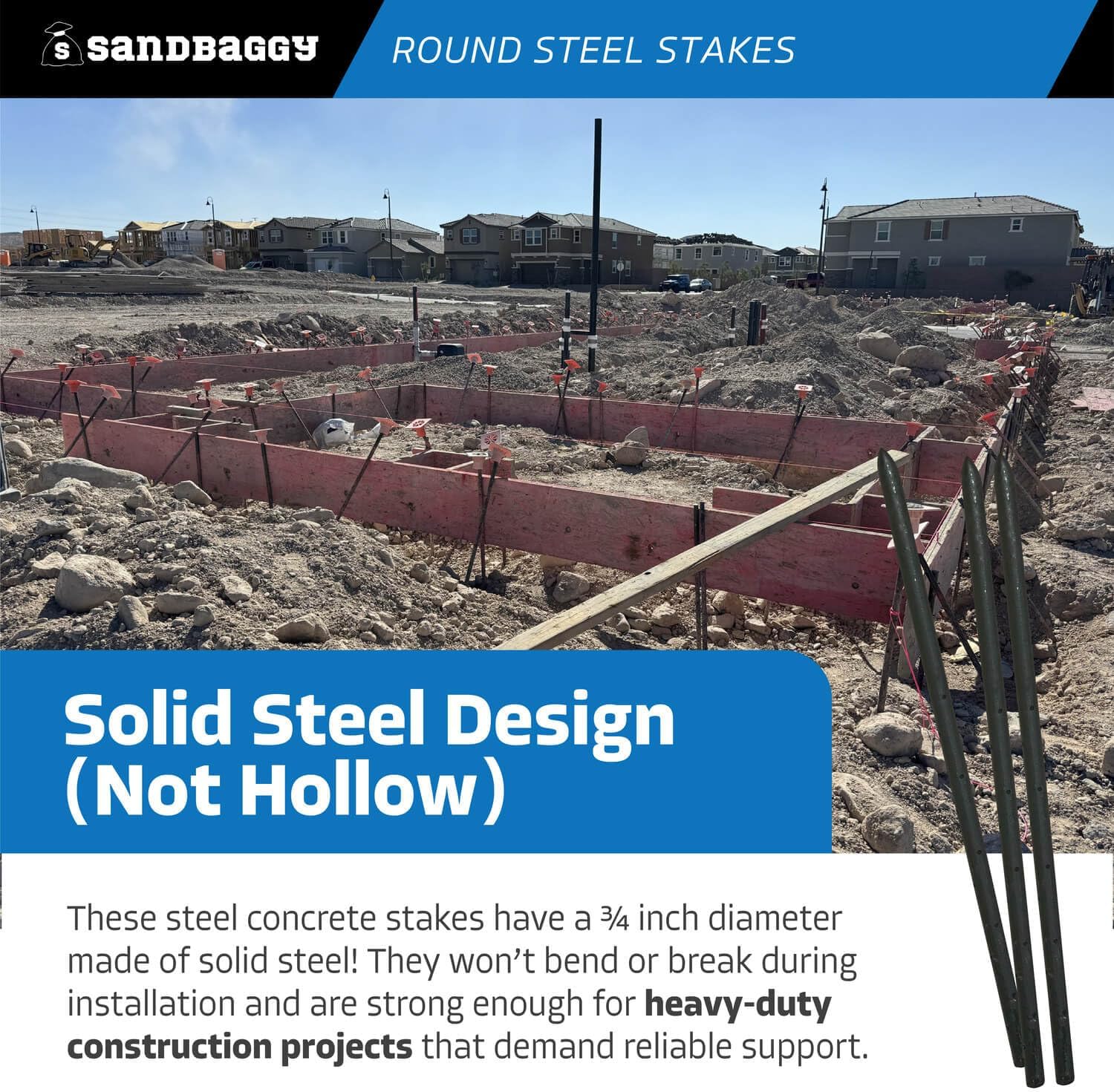 - SOLID STEEL DESIGN (NOT HOLLOW): These steel concrete stakes have a ยพ inch diameter made of solid steel! They wonโt bend or break during installation and are strong enough for heavy-duty construction projects that demand reliable support.