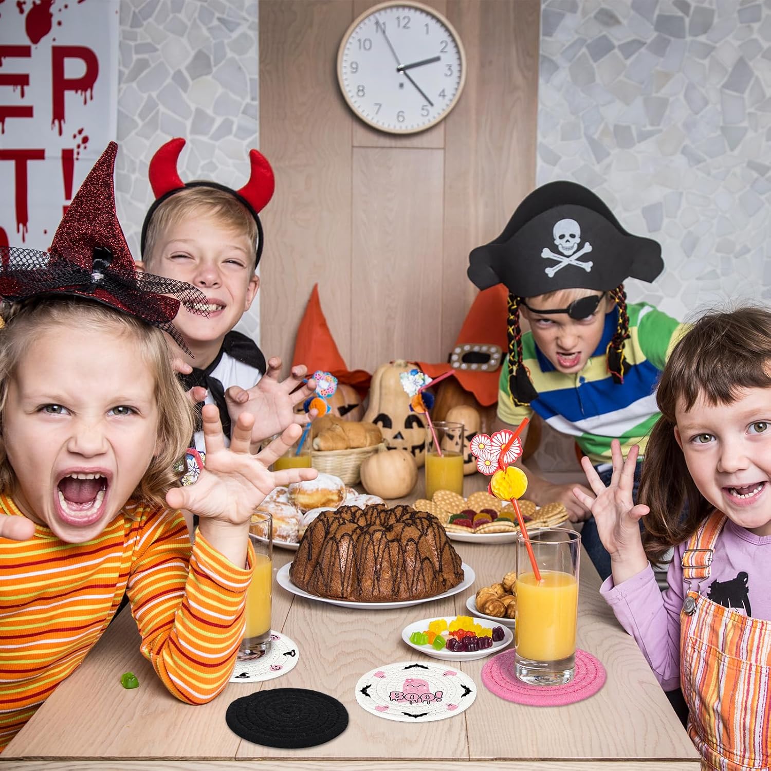 - Halloween Theme - Our drink coasters featuring halloween theme, patterned with pumpkin, ghost, bats and printed with the word of boo, mainly colored in pink and black, cute and delicate, will nicely increase the fun and festive atmosphere.