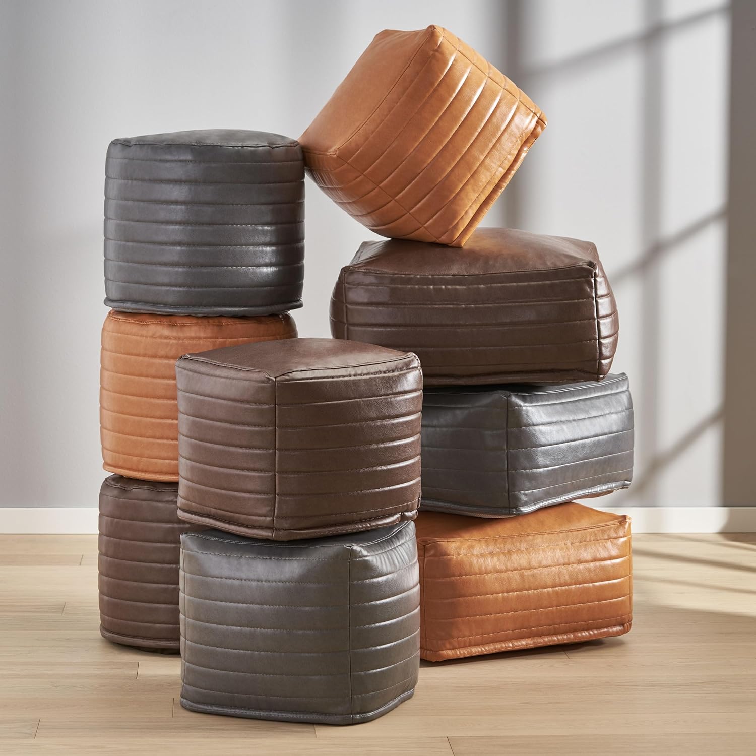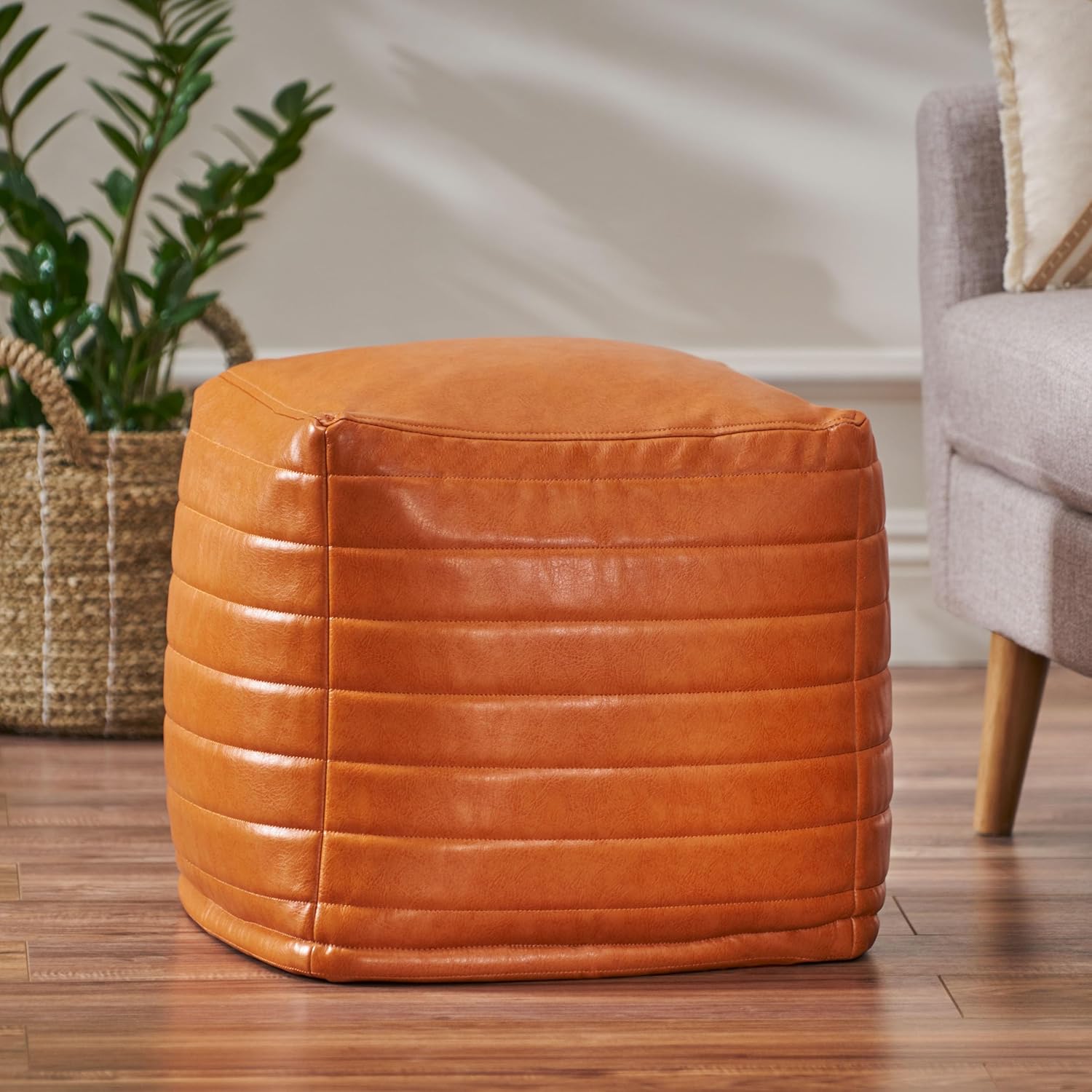 GDFStudio Contemporary Faux Leather Channel Stitch Pouf Ottoman Foot Stool - Bean Bag Floor Chair - Foot Rest Couch for Living Room Bedroom,Caramel Cube,16"" x 16"" x 16"", Conrai,caramel, 314802N