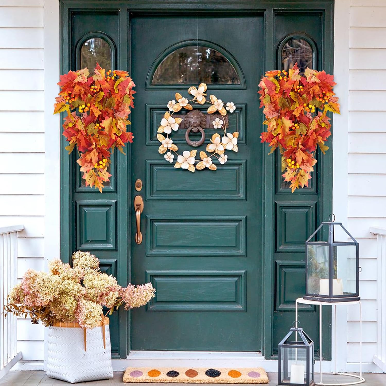 - [Material of Hanging Fake Maple Leaf] The fake maple leaf plants decoration is mainly made of quality silk cloth leaves with orange and green color,berry,detachable,durableand and the stem is embedded with iron wire inside,they have a realistic appearance and are close to nature .Faux maple leaves garland is perfect for indoor or outdoor decor.