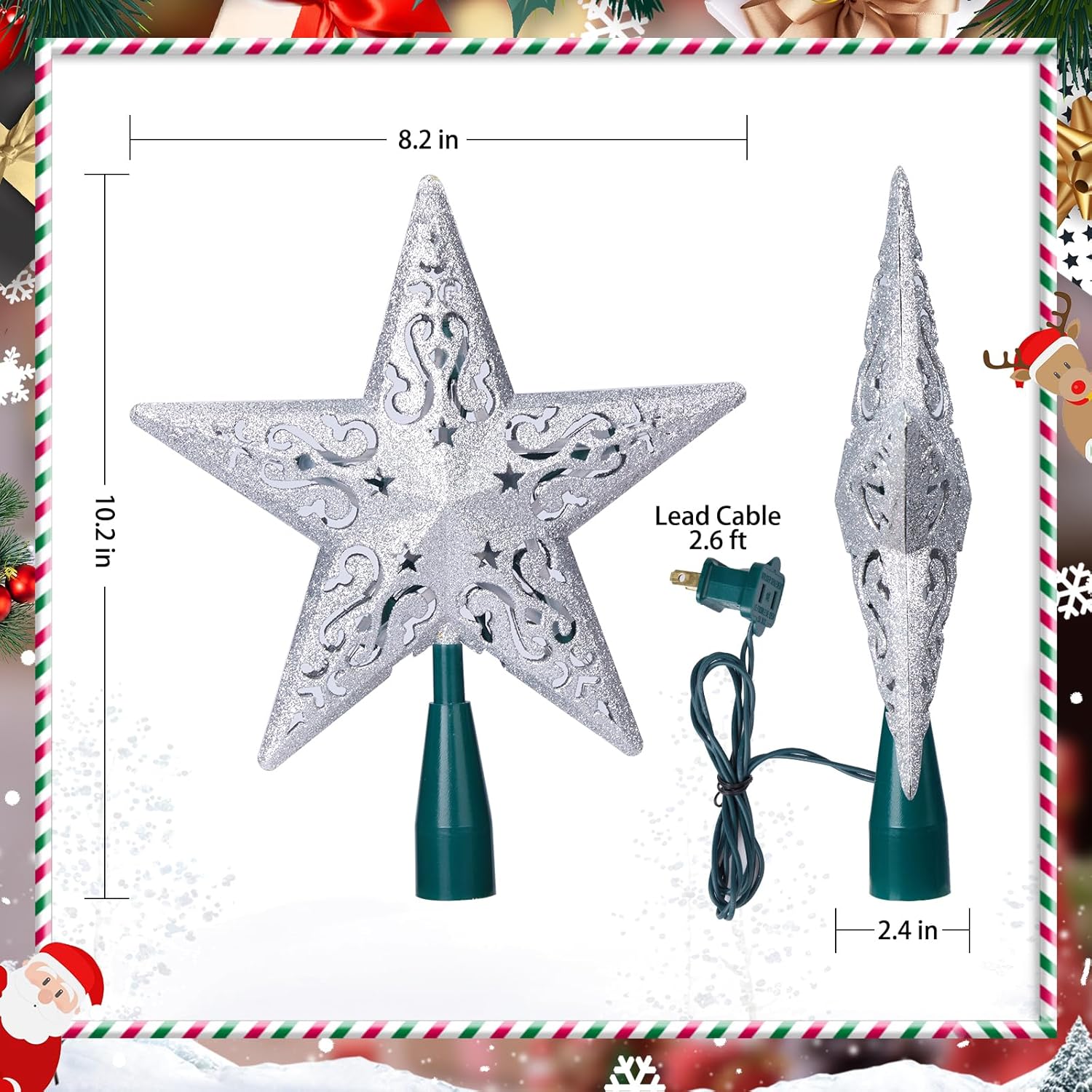 8" Silver Glittered Hollow Christmas Star Tree Topper with Built-in 10-Bulb String Lights and 2 Fuses for Holiday Decor, Green Base