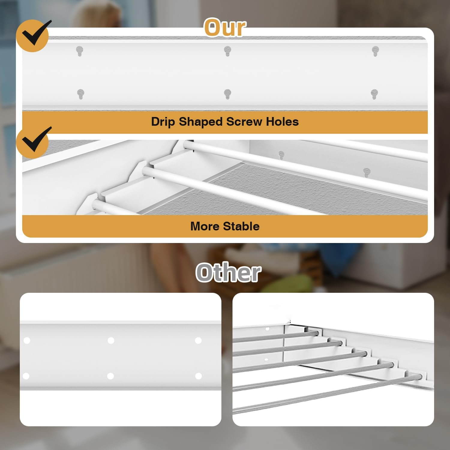 - Heavy Weight Capacity: Solid structure, main frame 1.4mm thick, strong bearing capacity and stability, rust-proof and wear-resistant. Foldable wall mounted clothes drying rack: 4 heavy aluminum rods, equivalent to 11.2 feet of linear suspension line, can withstand 60 pounds of weight. Use this expandable clothes hanger in your laundry and bathroom to create a flexible and convenient clothes hanging system.