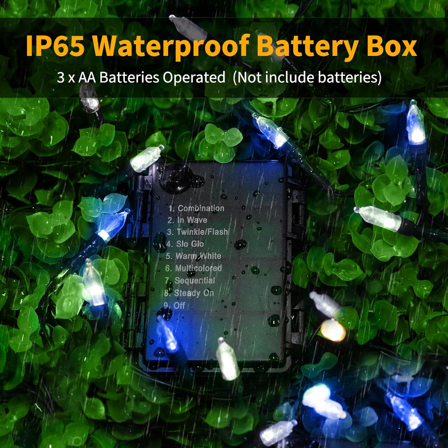 - 【Battery operated】3 AA batteries (Not included) operated, 2 pack 18 feet 50 mini LED strands, 3.94 inch lights spacing with compact water resistant battery control box, energy saving and eco-friendly. Operation time depends on the running time and the quality of installed battery