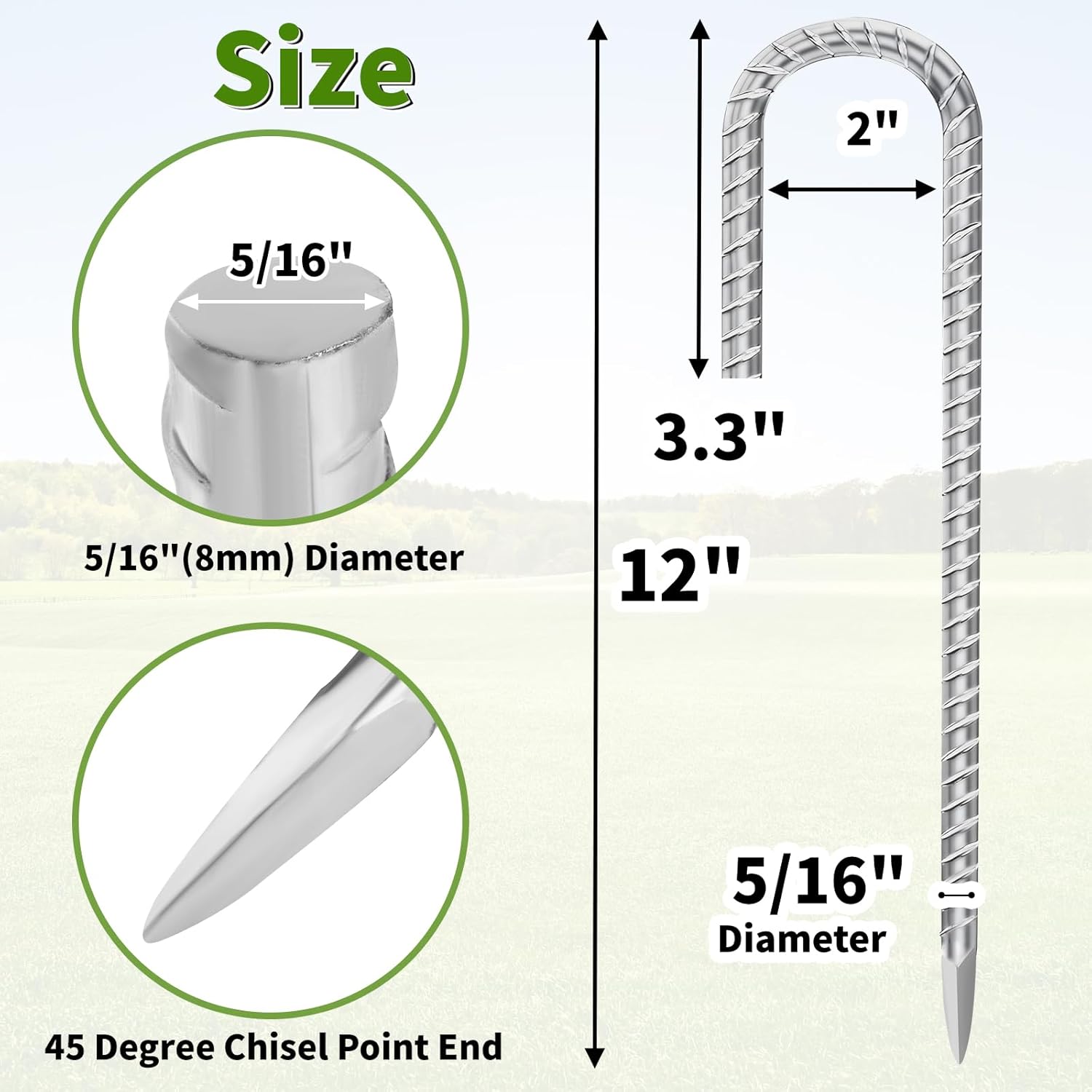 - 【12 Inches Rebar Stakes】Sold in bundles of 60 pieces. 12 inches length from tip to hook, 5/16 inch (8mm) diameter j stakes. The hook is 3.3" and spacing is 2", pefect for chain link fence, holding outdoor decorations, greenhouse, canopies, gazebos and giant inflatables etc.