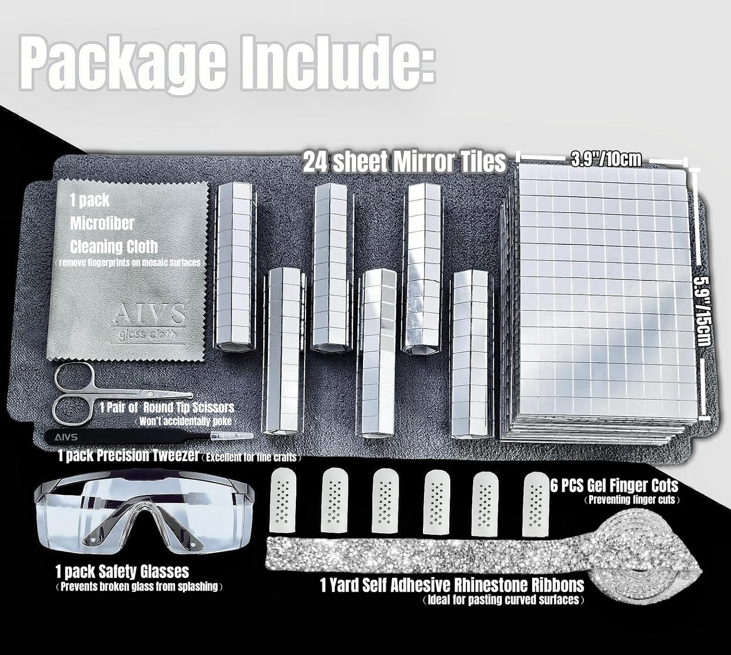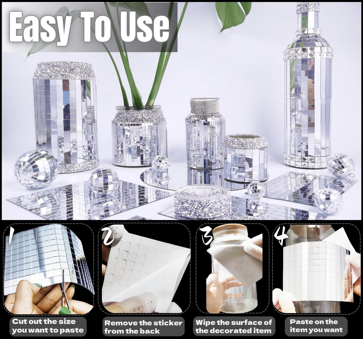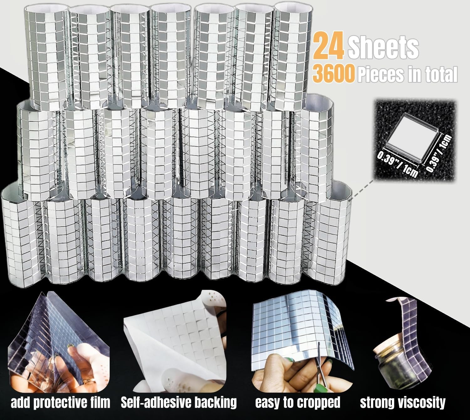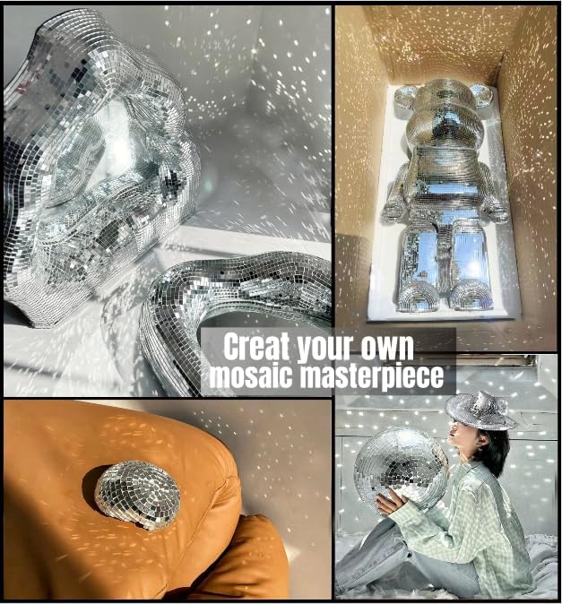 - š„ćSpend Less & Get MorećNewly upgraded with more quantity and better craftsmanship, DIY accessories are provided.Come with 24 sheets Mini Mosaic Stickers,1 roll rhinestone ribbon,1 scissors,1 tweezer,1 galss cloth and 6 silicone fingertips.Each Disco Ball Mirror Tile contains 150 1cm x 1cm square mosaics for a total of 3600 pieces,quantity sufficient for use.