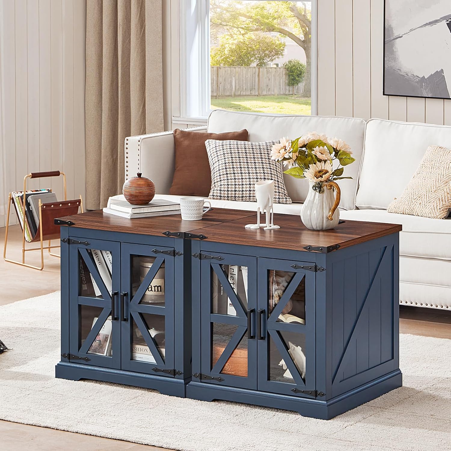 - š”[Functional Art Piece]The oversized end tables living room storage design provides convenient storage for your living space. The built-in shelves can be adjusted to 3 different heights as per your needs, accommodating an abundance of books, blankets, or coffee mugs. The glass barn-style doors blend traditional farmhouse aesthetics with a modern sensibility, transforming this piece into a more contemporary farmhouse night stand, coffee table, bedside table, or side-of-sofa art.