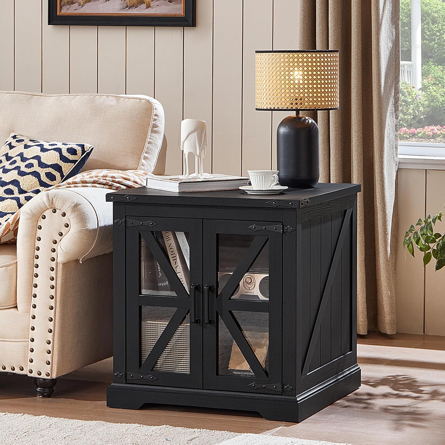 - š”[Functional Art Piece]The oversized end tables living room storage design provides convenient storage for your living space. The built-in shelves can be adjusted to 3 different heights as per your needs, accommodating an abundance of books, blankets, or coffee mugs. The glass barn-style doors blend traditional farmhouse aesthetics with a modern sensibility, transforming this piece into a more contemporary farmhouse night stand, coffee table, bedside table, or side-of-sofa art.