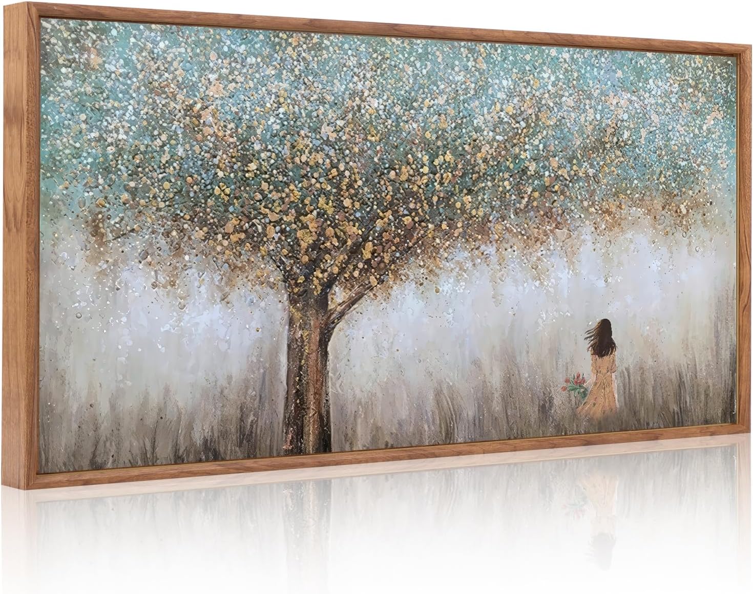 Aurlan Tree of Life Hand Painted Framed Wall Decor(40"x20"), Large Abstract Girl under Tree Oil Painting Canvas Artwork, Modern Nature Landscape Art for Office Living Room Bedroom