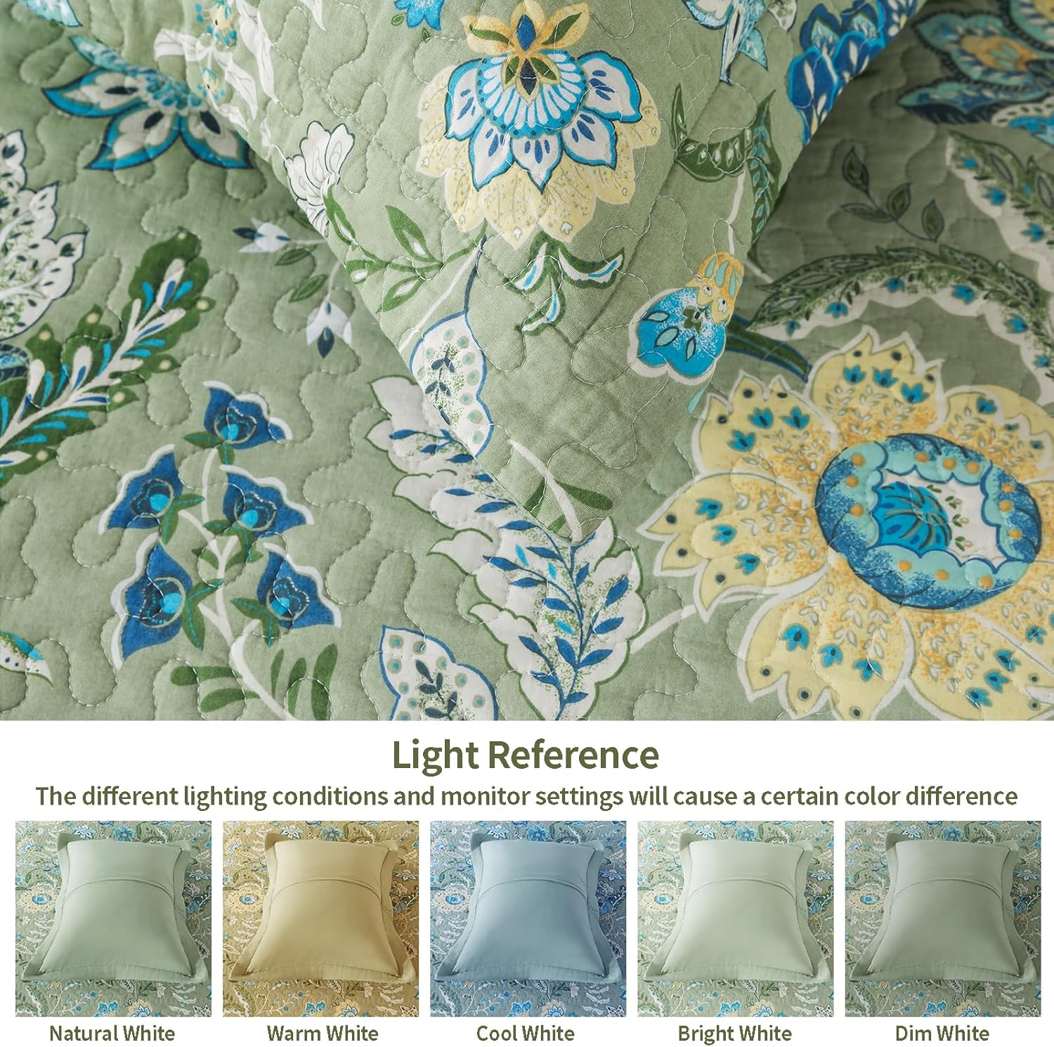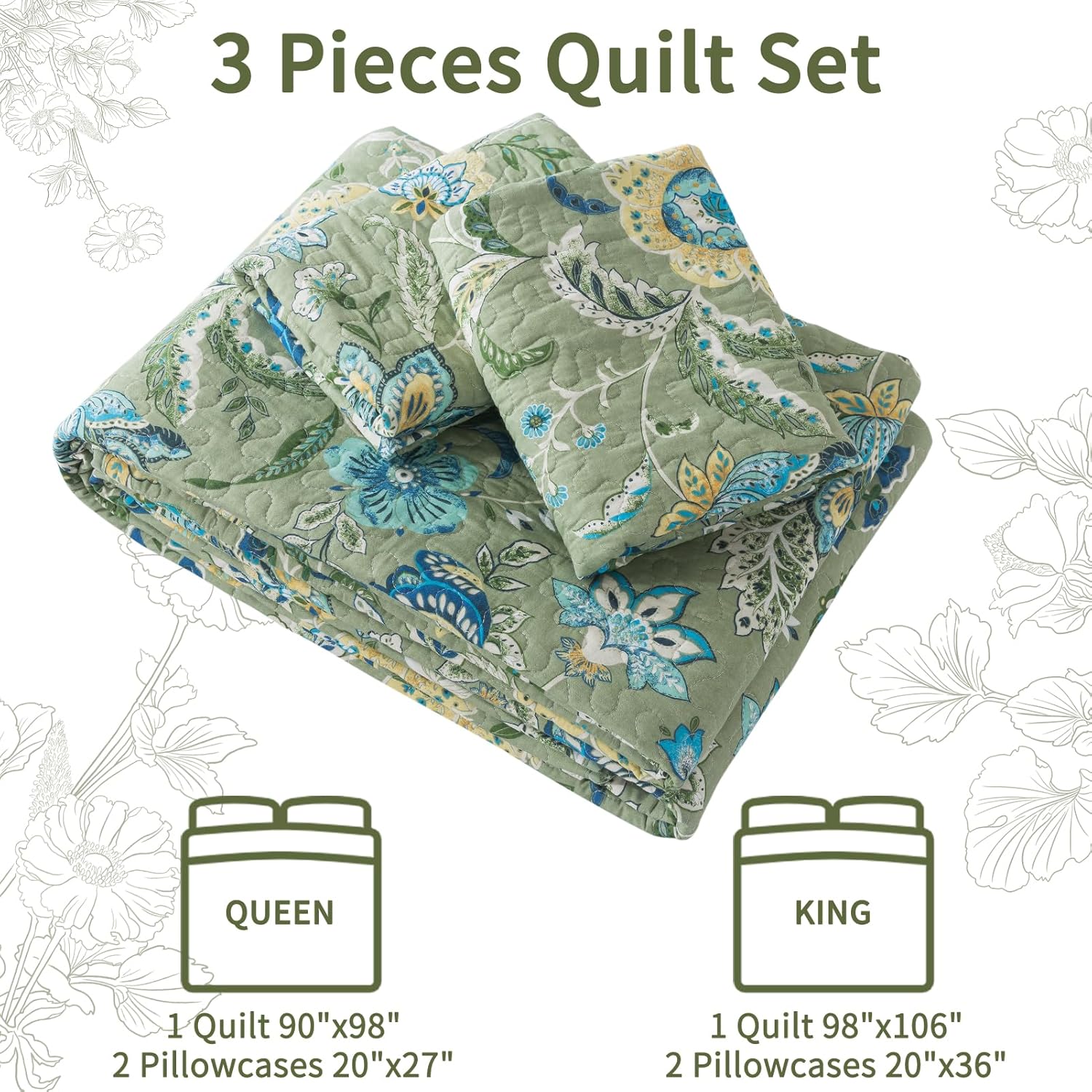 VAPUTAR Queen Quilt Bedding Set - Cotton Bedspreads Queen Size (90 x 98 inch) with Floral Pattern, Farmhouse Lightweight Queen Size Quilt Suitable for All Season(3 Pieces, Olive Green)