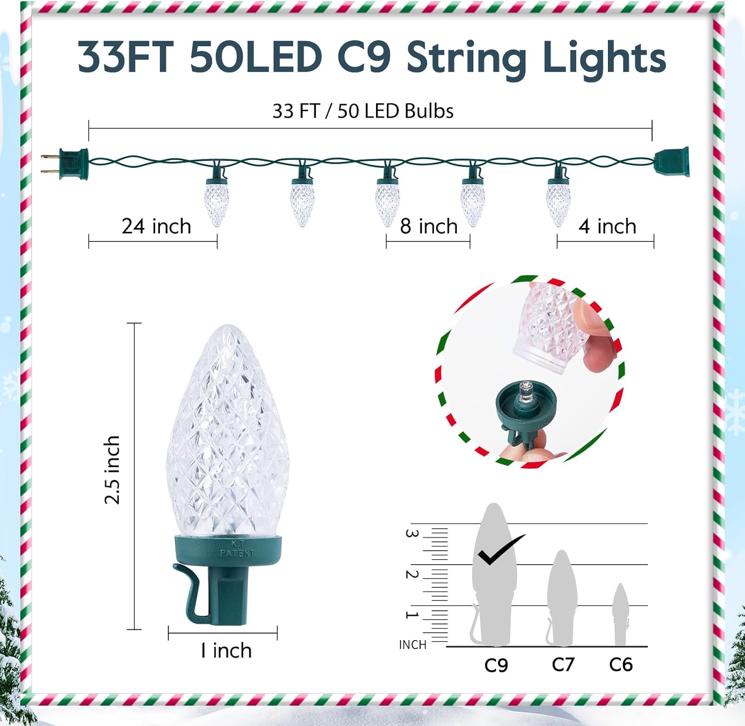- 50 LED C9 Christmas Lights: The plug-in C9 Christmas lights are 33 feet long and feature 50 bright strawberry-shaped LEDs with 8-inch spacing between each bulb. Green cord is more suitable for Christmas tree decoration, adding a festive and warm atmosphere to your home.