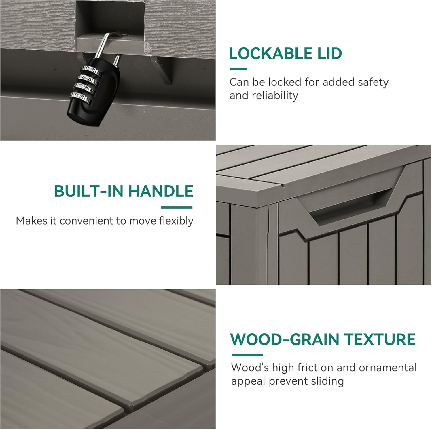 - Generous Storage Space: The deck box has overall dimensions of 44.9"L x 16.7"W x21.6"H internally and 45.3"L x 18.4"W x22.8"H externally, offering ample storage capacity of 80 gallons; Its unique wood grain texture not only grants storage space but also enhances the aesthetic appeal of both indoor and outdoor environments