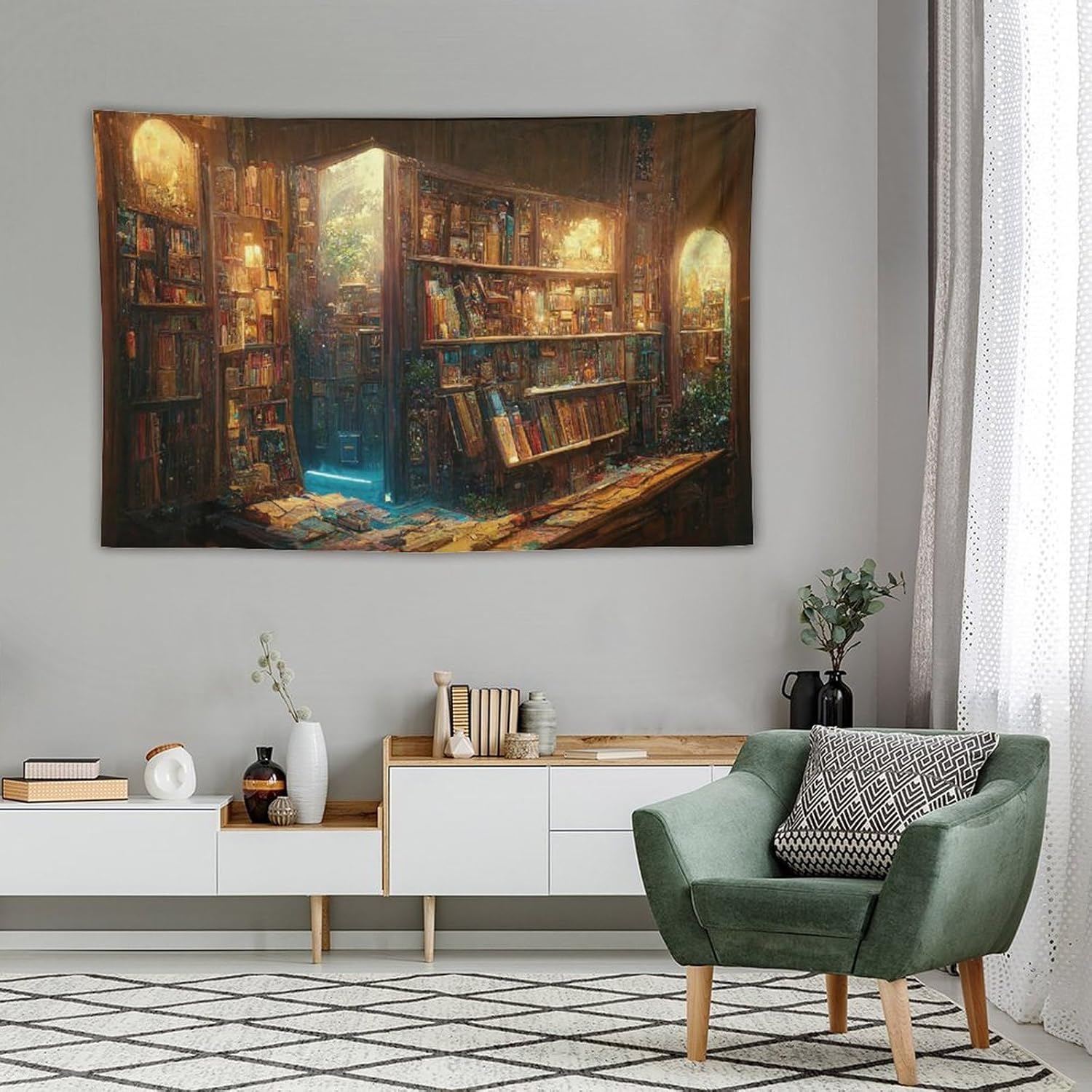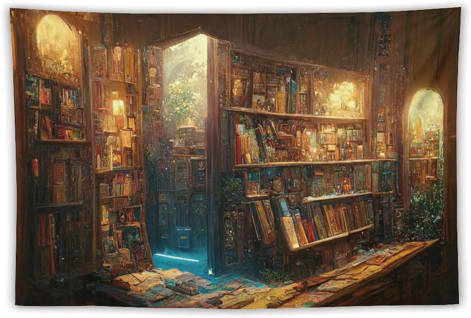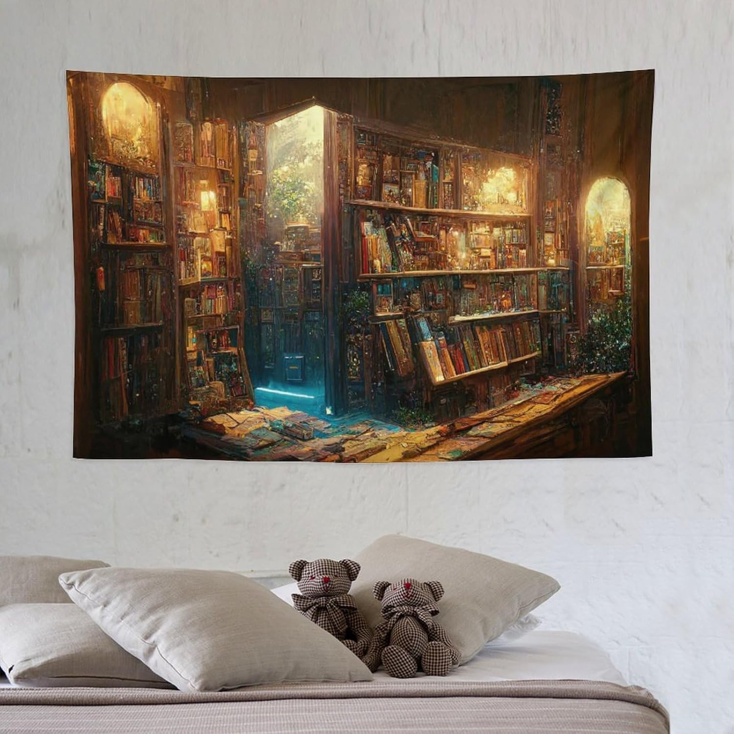 Kurtect Bookshelf Tapestry,Vintage Style Library Watercolor Art Theme Pattern Print Tapestries for Party Beach Picnic Blankets Tablecloths Living Room Wall Deocr, 40x60 in