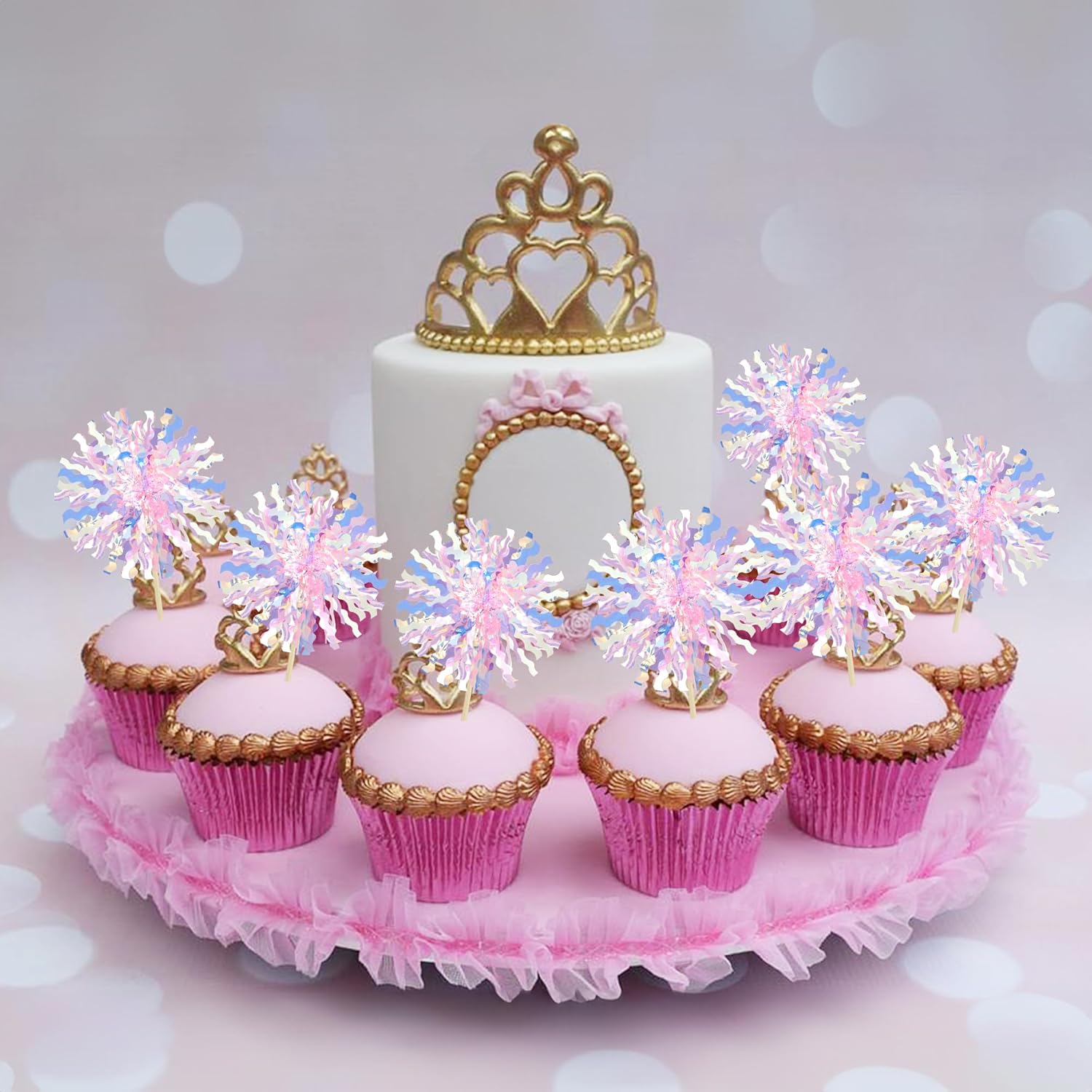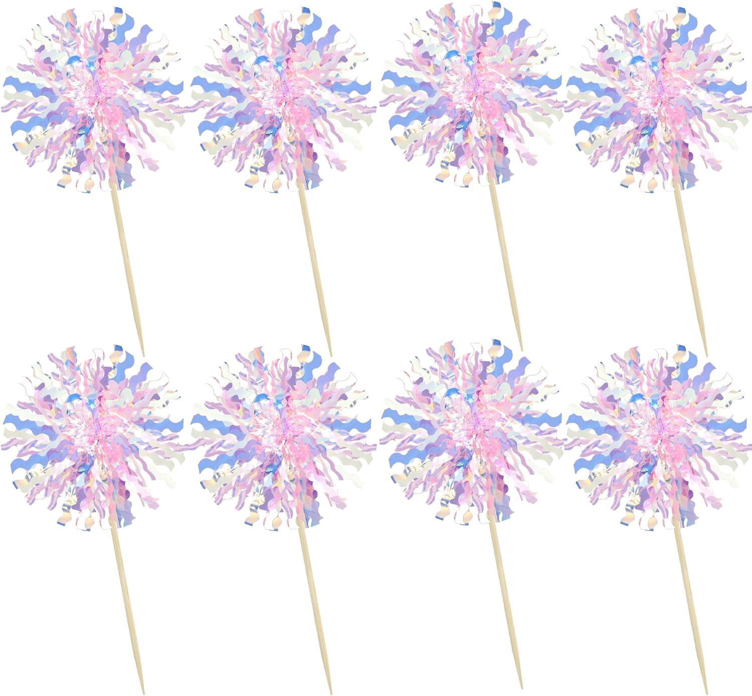Ephlyn 30Pcs Foil Firework Cupcake Toppers Firework Cake Toppers Tinsel Flower Drink Stirrers Cocktail Food Fruit Toothpicks for Valentine's Day Party Decorations Pink