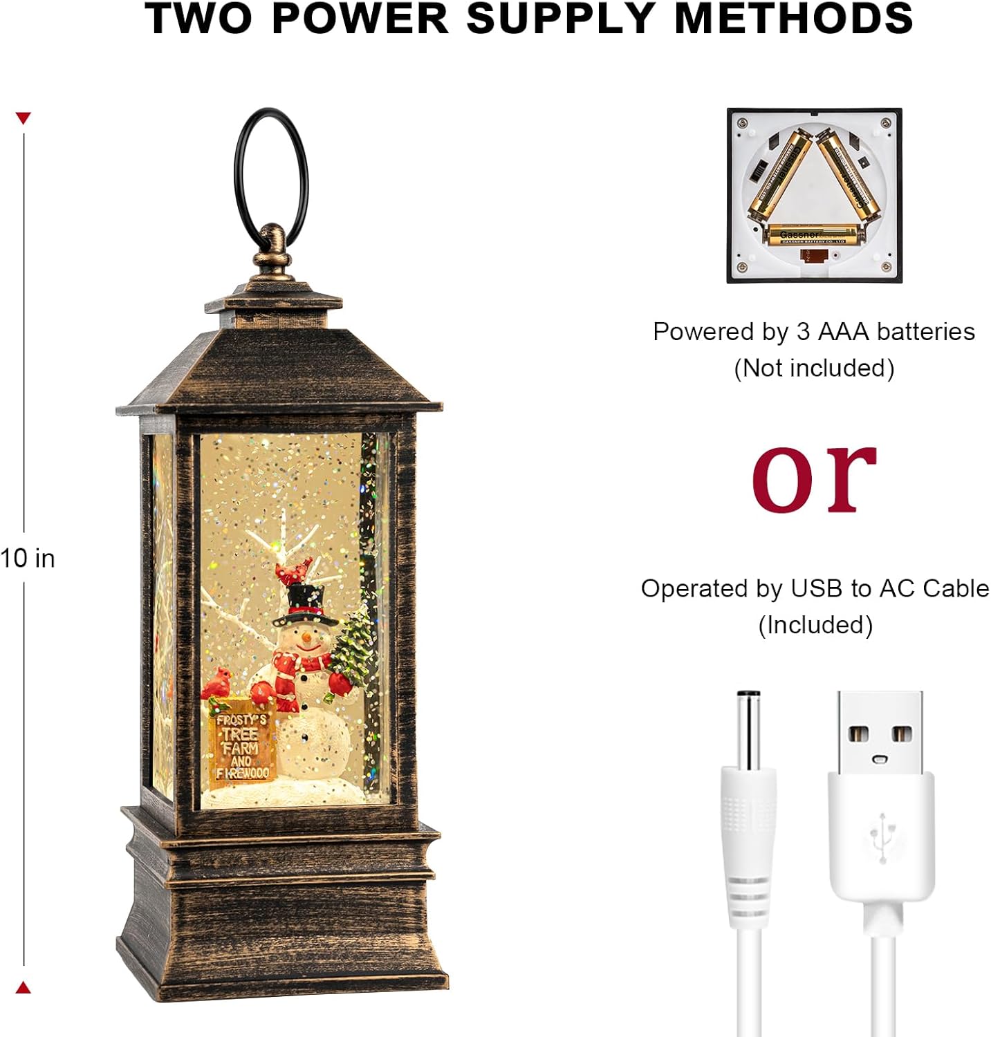 - 🎅🎄【Two Mode Power Supply】Powered by USB to DC cable (include), the snow globe lantern can be operated without batteries, which can save you a lot on batteries. & Powered by 3 AA batteries (not included), you can place it at any place that you want to add warm ambiance.