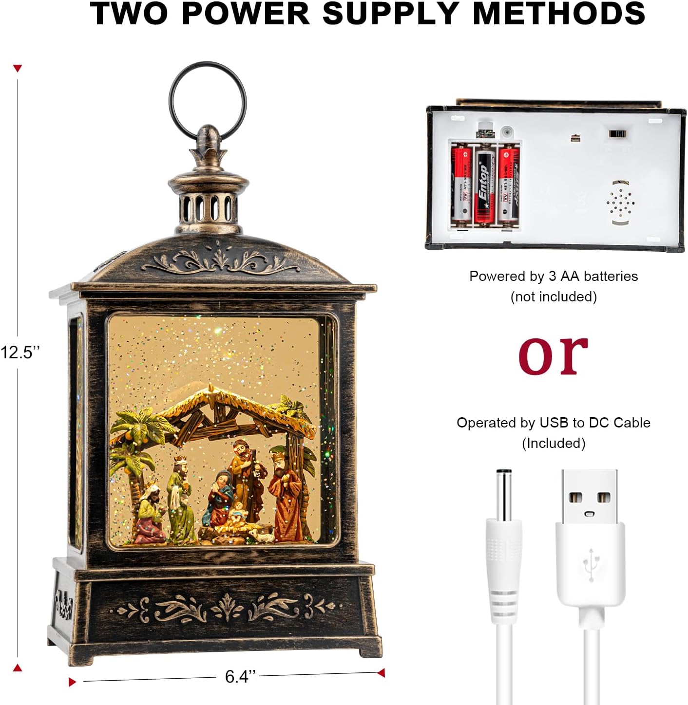 Christmas Snow Globe Glittering Nativity Scene with Music & Timer, USB Lined/Battery Operated Lighted Water Lantern for Christmas Festival Decoration Gifts