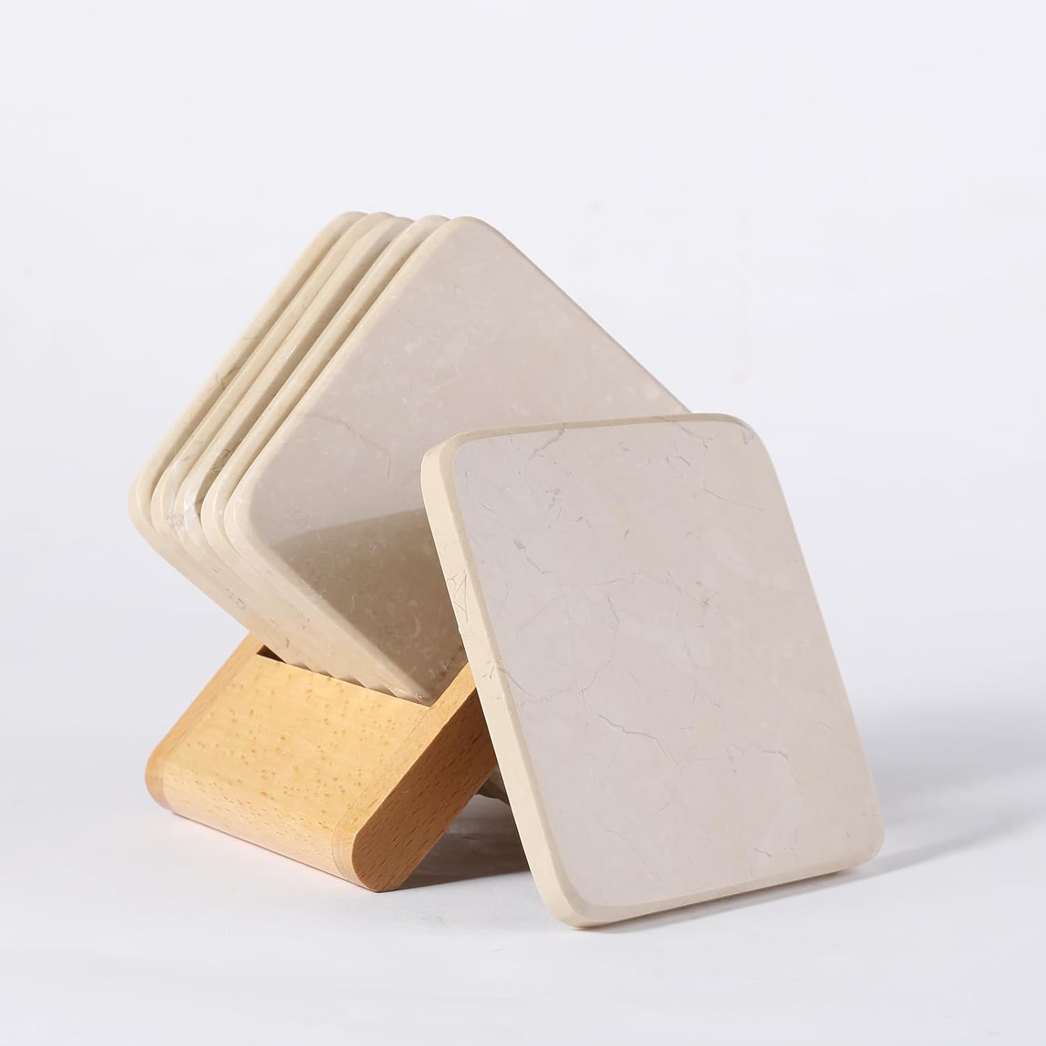 - Premium Solid Marble Coasters Set of 6 - Handcrafted from natural Crema Beige marble, these square coasters feature unique veining for elegant table decor. Ideal for elevating your coffee table, office desk, or bar setup with timeless luxury