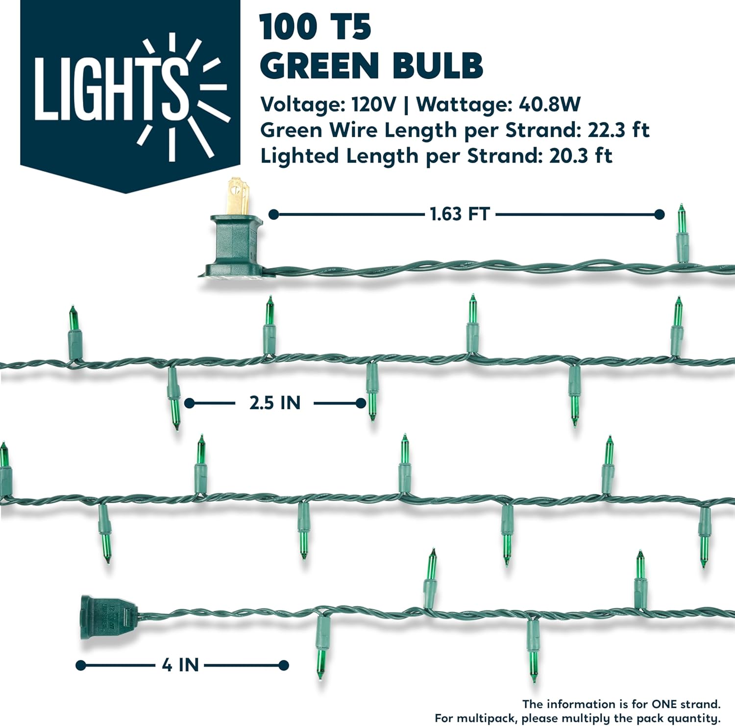 - SUPER VALUE PACK. Our Christmas String Lights has a total of 100 Christmas Lights, Green T5 Bulbs with Green Wire. 40.8W 120V. Total Lighted Length is 20.3 Feet. Total Wired Length is 22.3 Feet. Bulb Spacing 2.5 inches. High Voltage. Come with 4 extra bulbs & 2 replacement fuses