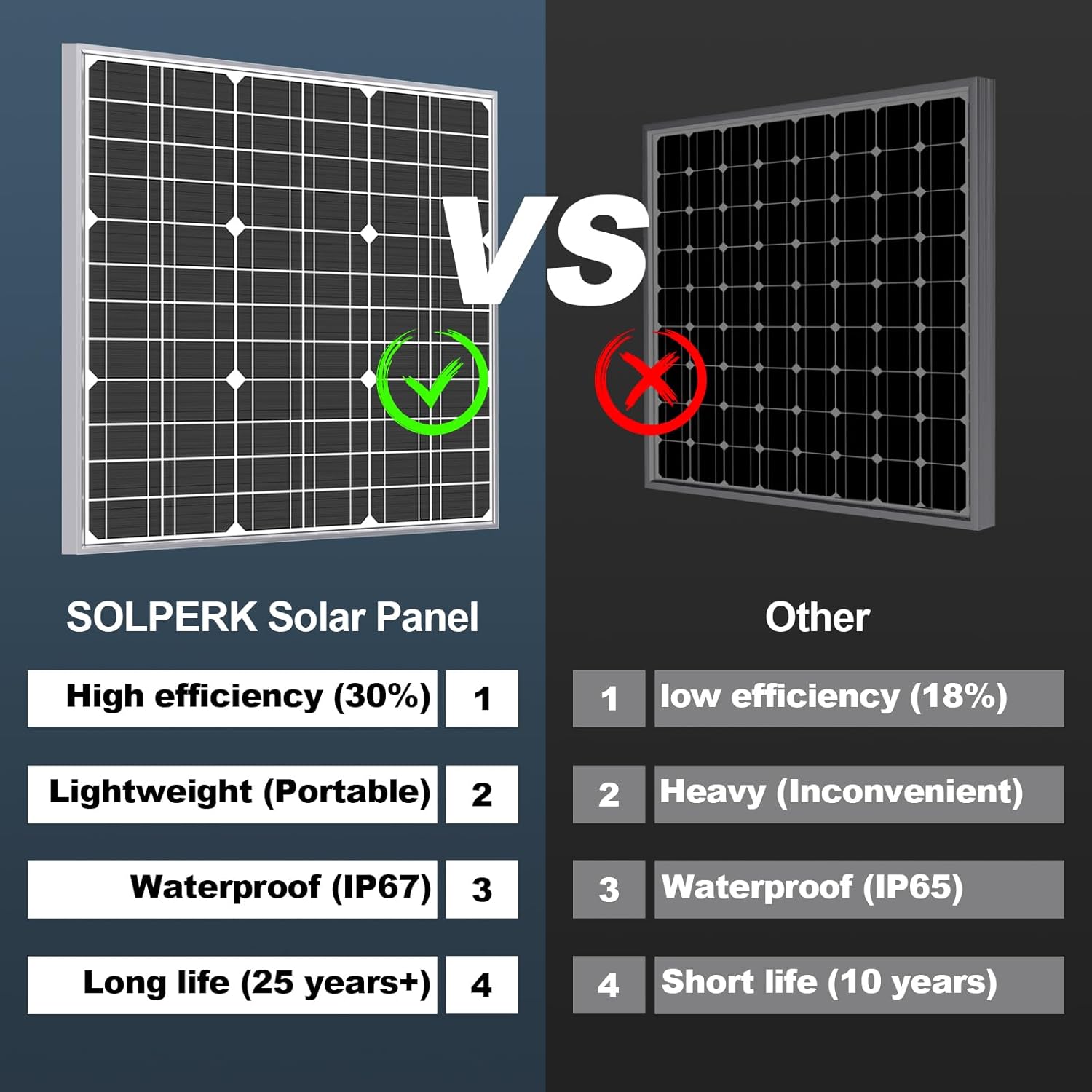 - 【360°Adjustable】The SOLPERK solar charger kit comes with a 360° adjustable bracket, allowing you to easily adjust it for optimal sunlight exposure. It can be easily installed on the ground, wall, or roof to maximize power generation. Additionally, the four corners of the solar panel are edged for added protection during use, ensuring the safety of the product and preventing scratches.