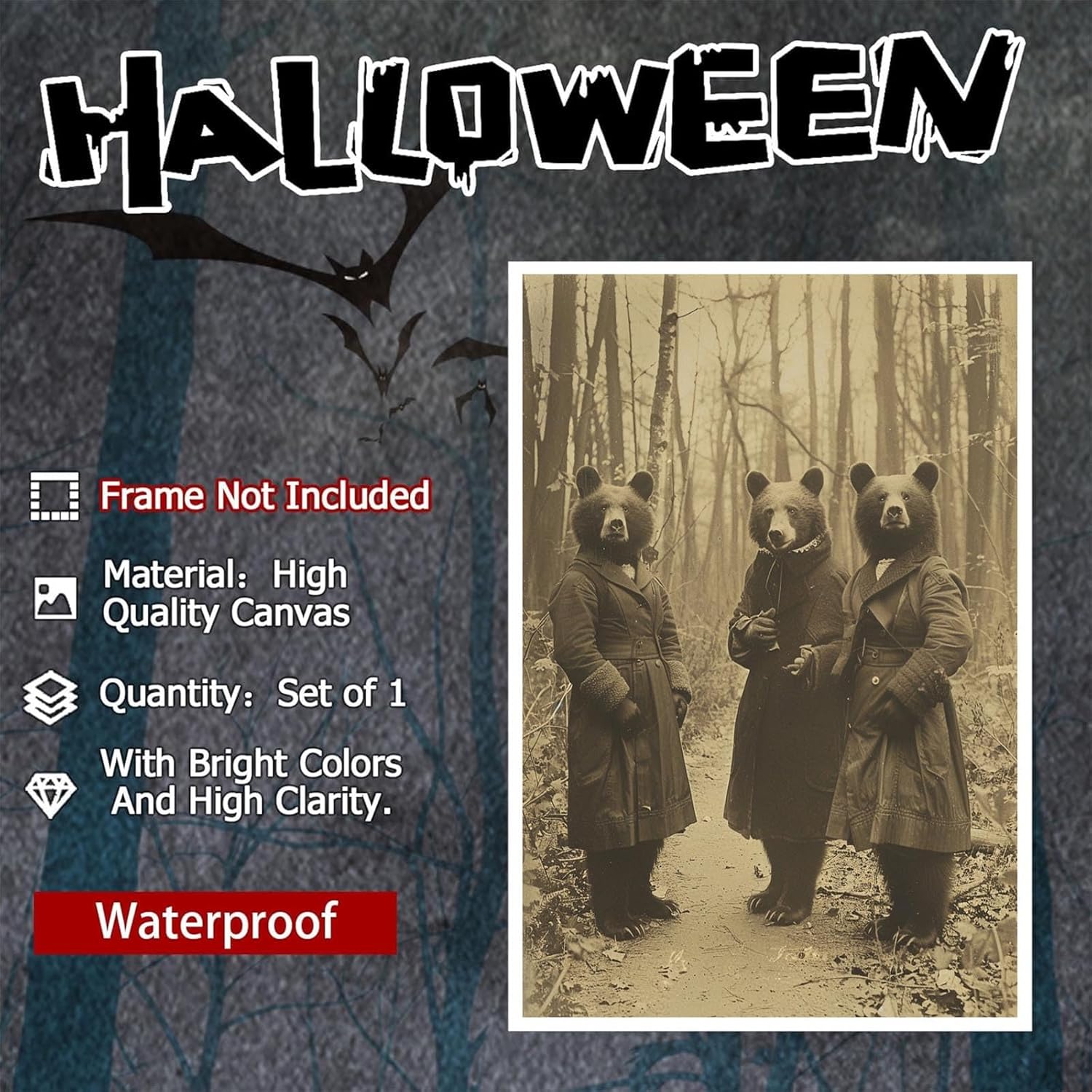 Vintage Horror Halloween Wall Decor Spooky The Three Bears In Occult Forest Spooky Canvas Wall Art Poster Gothic Dark Academia Decorations Room Creepy Print 16X24inch Unframed
