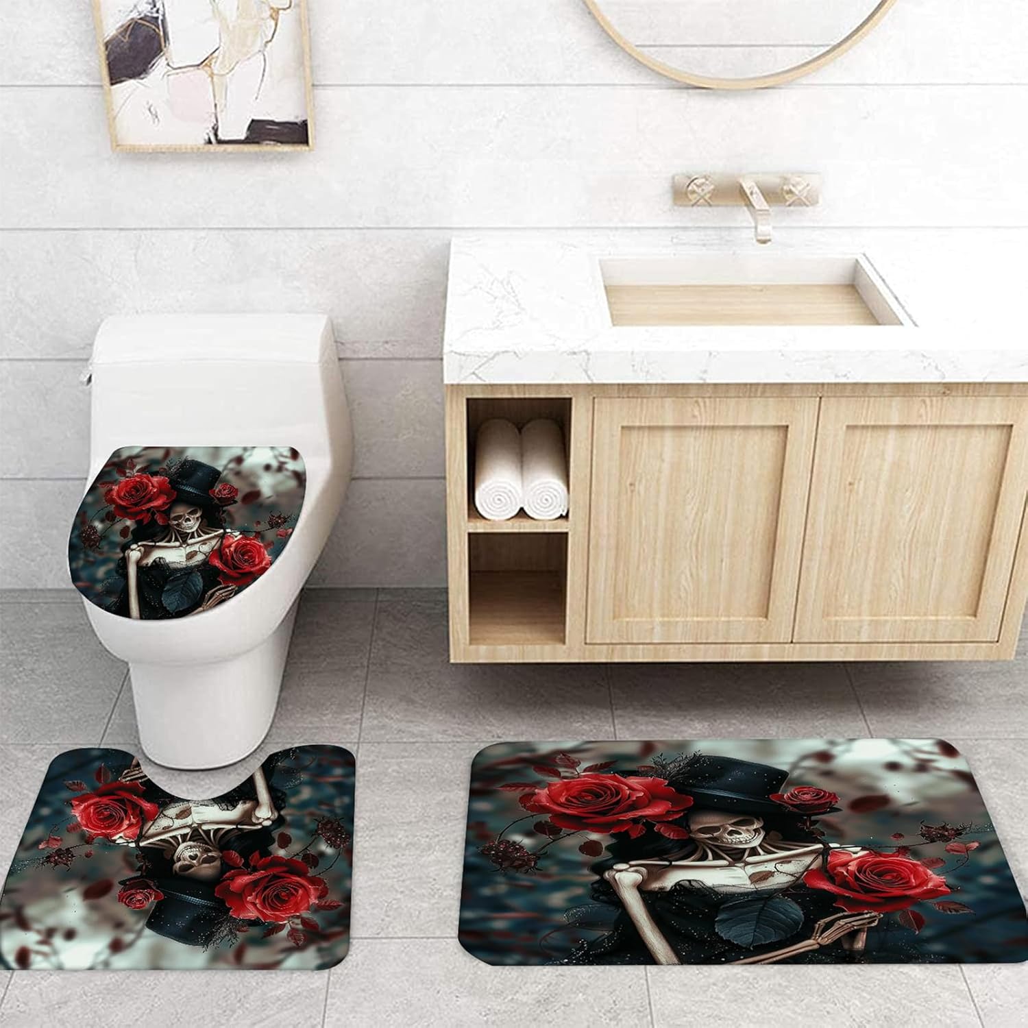 NEWSUYAA Halloween Decorations Shower Curtain Set with Non-Slip Rugs and Bath Mats,Black Skull Skeleton Bathtub Curtains with 12 Hooks,All Saints'Day (Nov 1st) Bathroom Decor