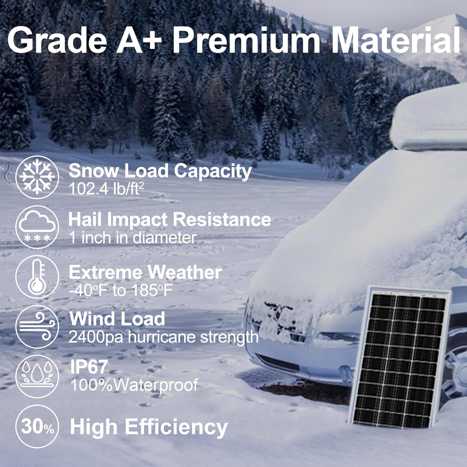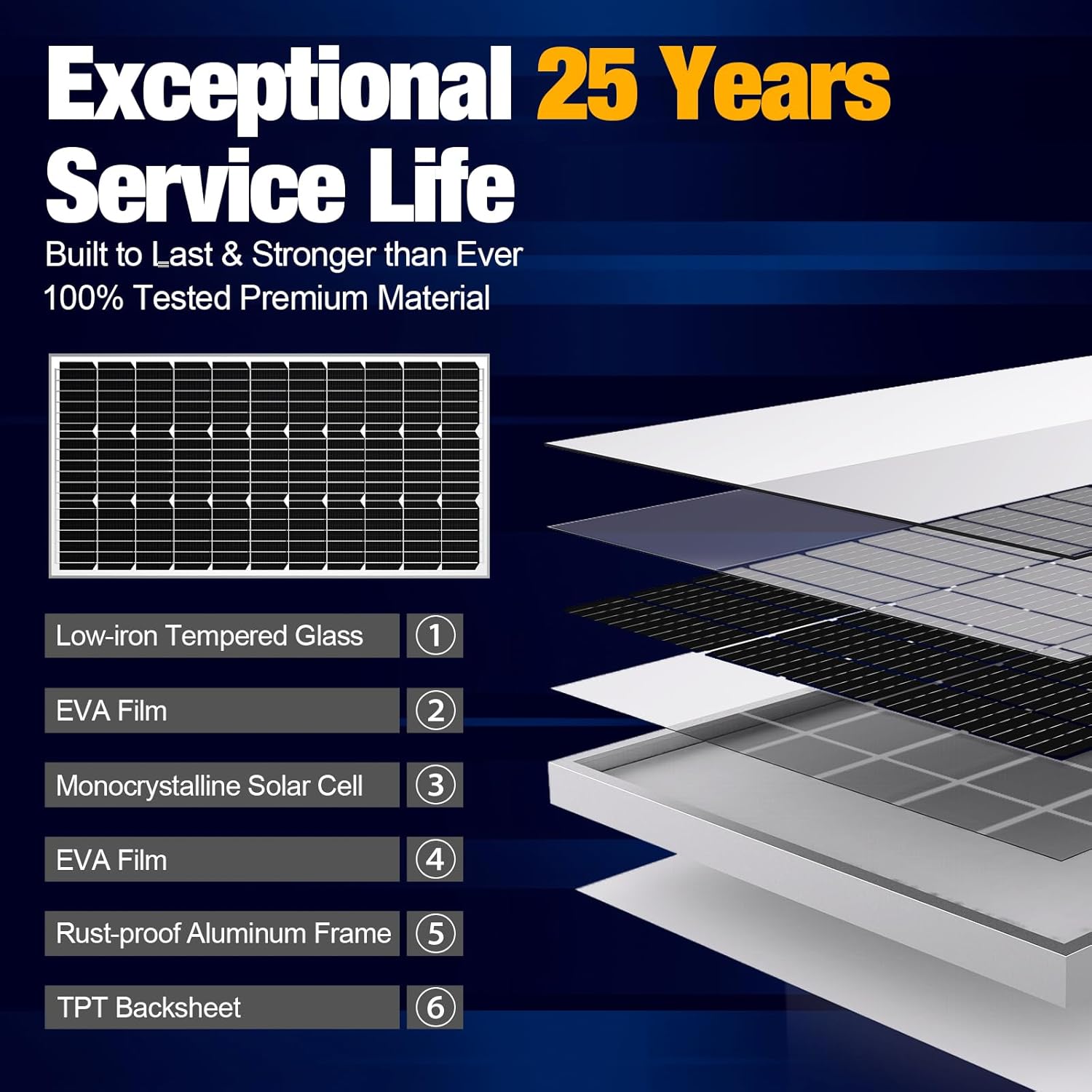- 【Various of Application】 SOLPERK Solar Panel own monocrystalline A+ solar cell. Its efficiency is an industry-best 30%, generating 400 watt-hours of power per day in four hours of full sunlight.Suitable for RV, sheds, caravans, motorhomes, boats, trailers, etc