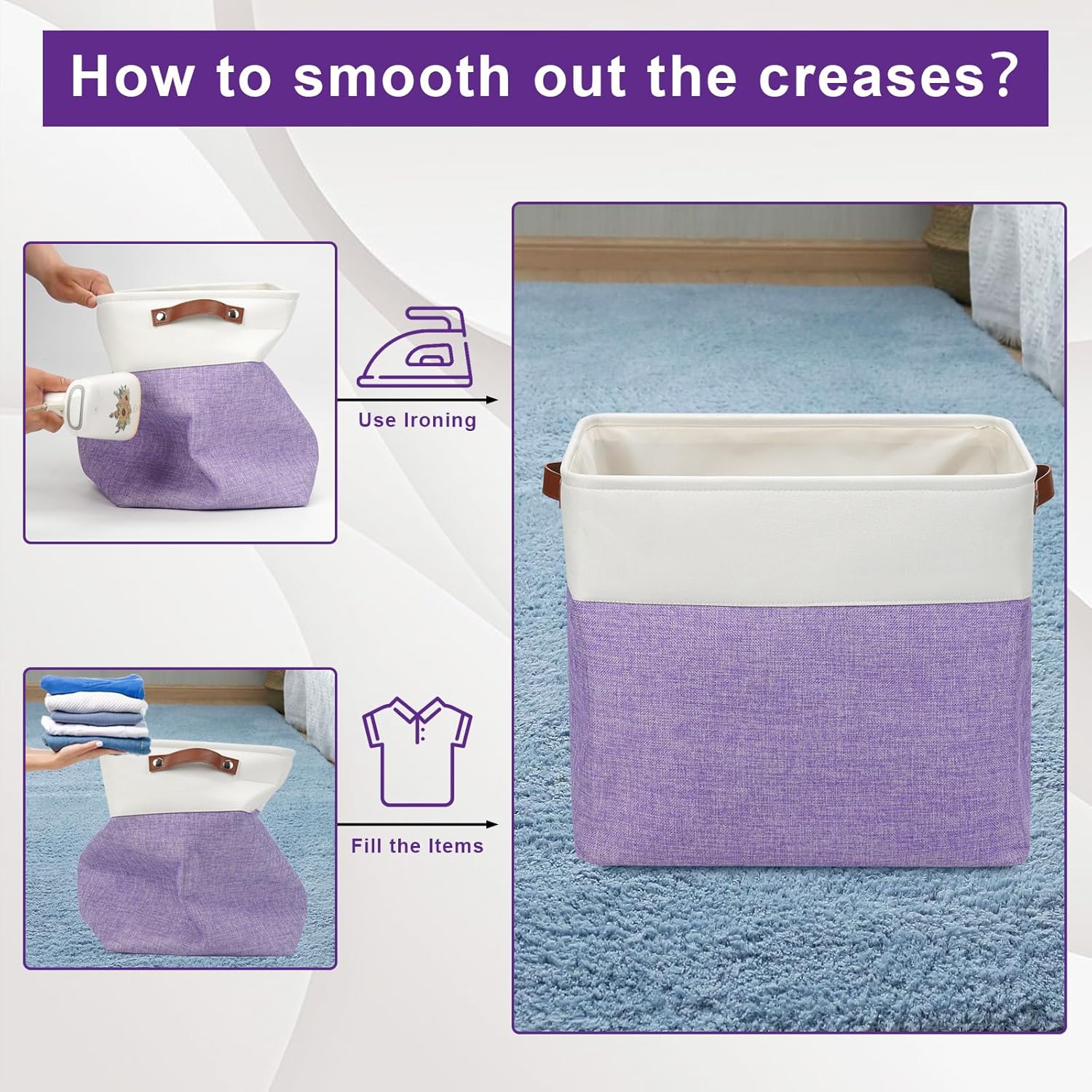 - 【Maintenance & Care Tip】 - Collapsible design for space saving. Our foldable baskets comes in a compression packing which may result in wrinkled storage bin during the long transit. Get rid of the wrinkles by either stuffing the fabric storage bins with blankets and pillows for a few days or steam iron them at low-heat setting. The organization baskets are easy to clean, you can dust the basket with a soft cloth with light soapy water when needed.