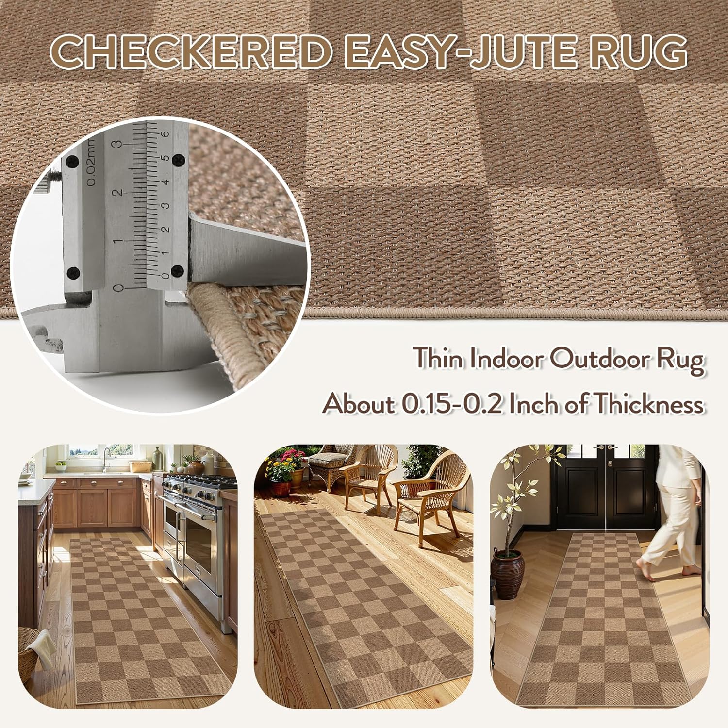 Lahome Checkered Easy Jute Kitchen Runner, 2x8 Washable Indoor Outdoor Runner Rug, Checkerboard Non Slip Non Shedding Neutral Carpet for Hallway Entryway Foyer