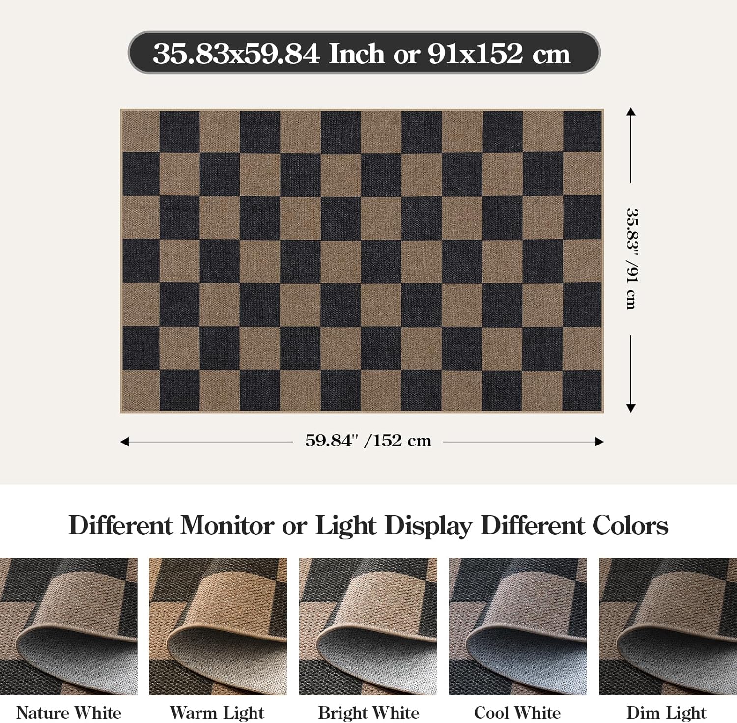 Lahome Checkered Easy Jute 3x5 Rug, Washable Rugs for Living Room Entryway Farmhouse Non Slip Black Outdoor Carpet, Checkerboard Indoor Door Mat for Entry Patio Deck