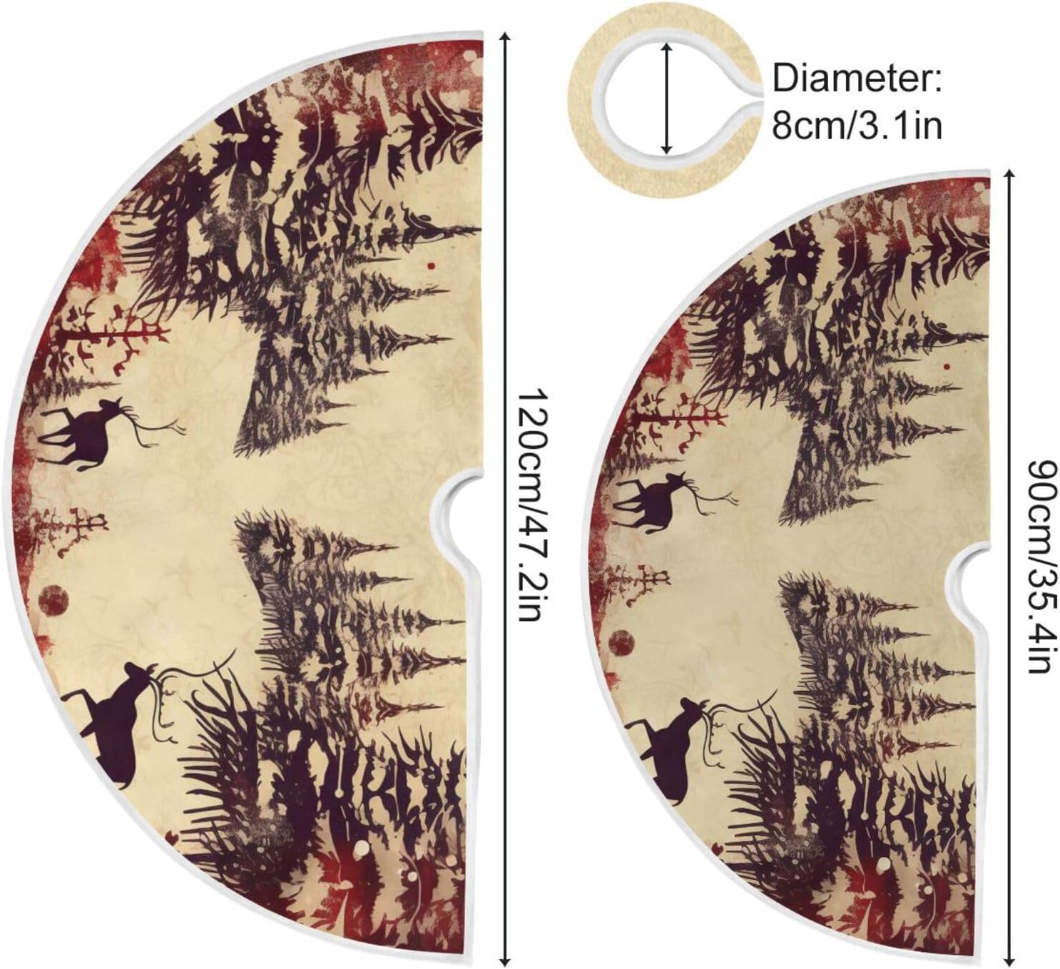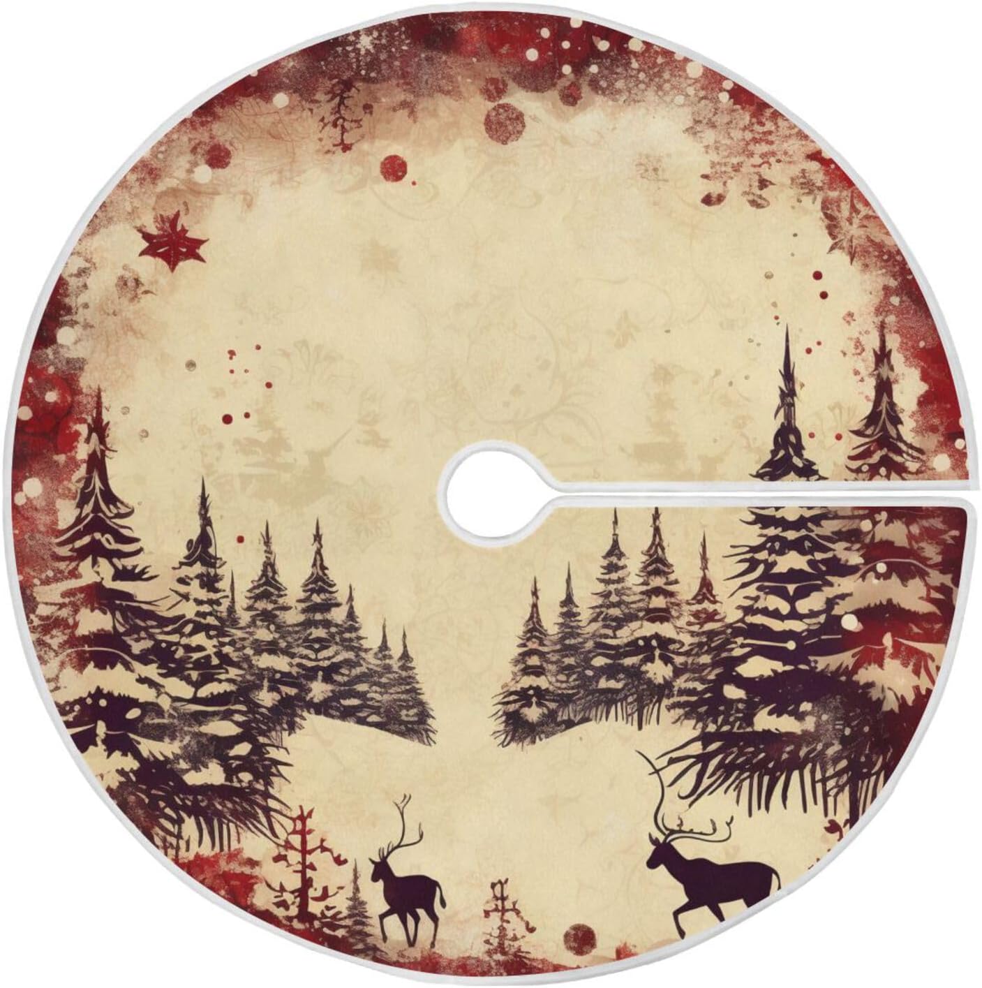 Vintage Red Elk Christmas Tree Skirt - 48 Inch Xmas Tree Mat for New Year Party Decorations