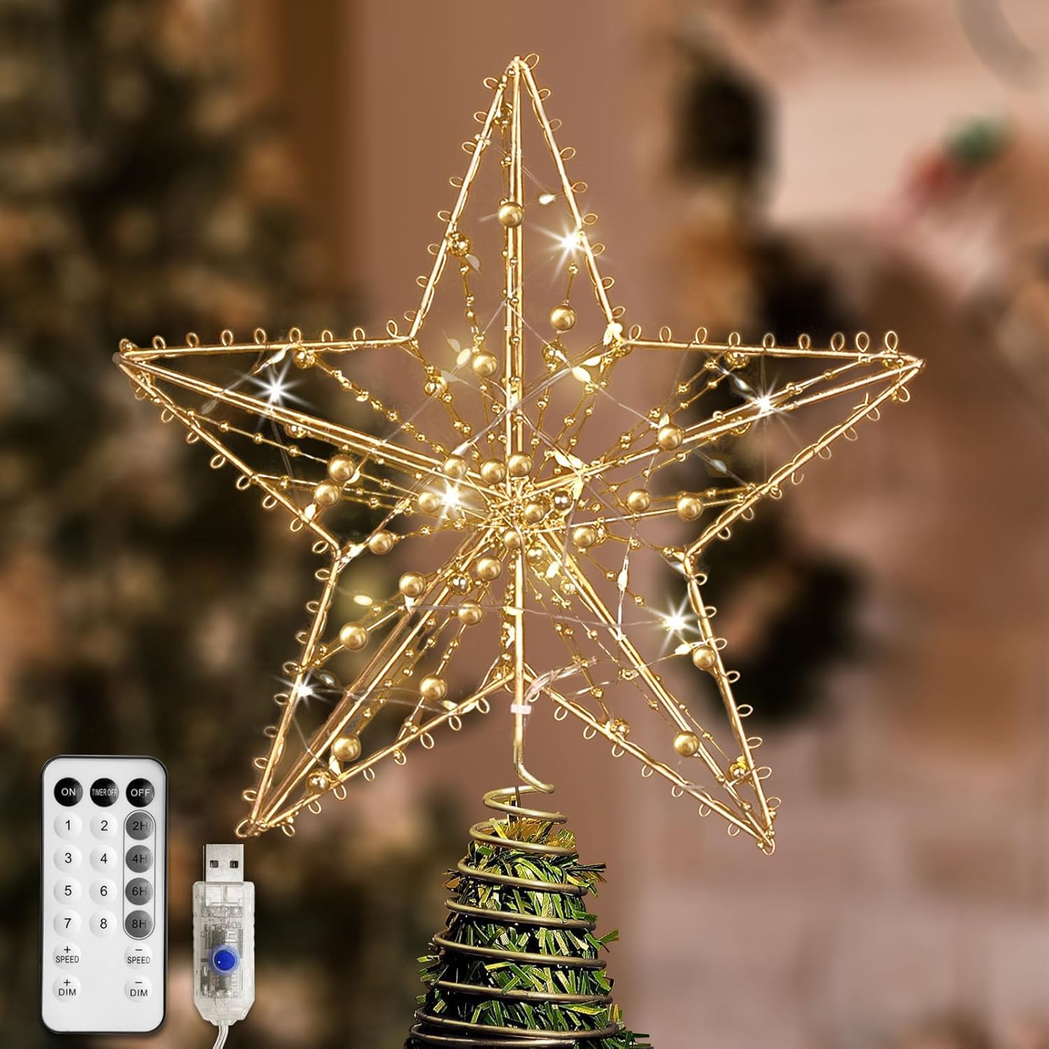 - GOLD PEARL BEADS STAR TREE TOPPER: Designed in the shape of a star, wrapped in a string of warm LED lights that glisten in the charming warm light, this hollow star decoration adds sparkling elegance to your Christmas tree. The surface of our Christmas tree decoration has many shiny sequins and powders that sparkle in the light to add an elegant and fantastical atmosphere to any Christmas decorating theme