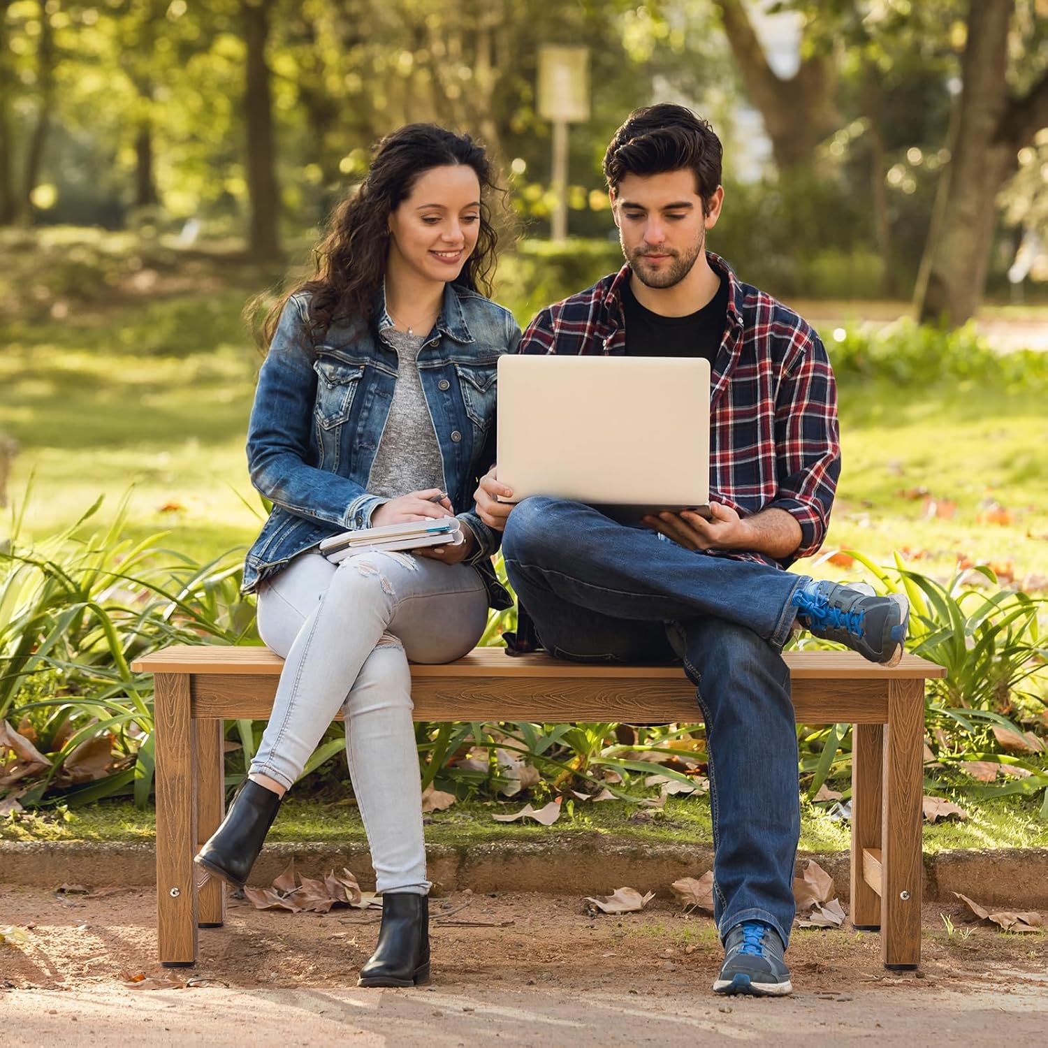 Outdoor Bench, 2-Person Poly Lumber Garden Bench, All-Weather Patio Bench Will not Rot and Fade for Garden, Porch, Backyard and Park, Easy Installation, Teak