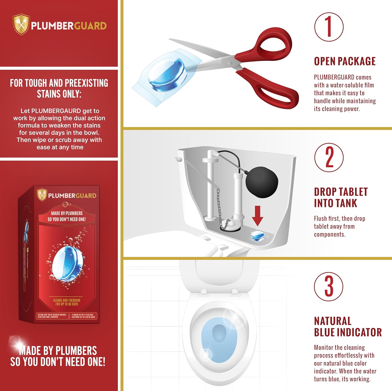 - Effective Cleaning: PLUMBERGUARD is formulated with a low-impact chelating agent and whitening agents, designed by plumbers for a powerful yet gentle clean. It actively whitens while fighting tough stains, rust, mineral deposits, and limescale buildup, ensuring a pristine toilet bowl without harsh chemicals.