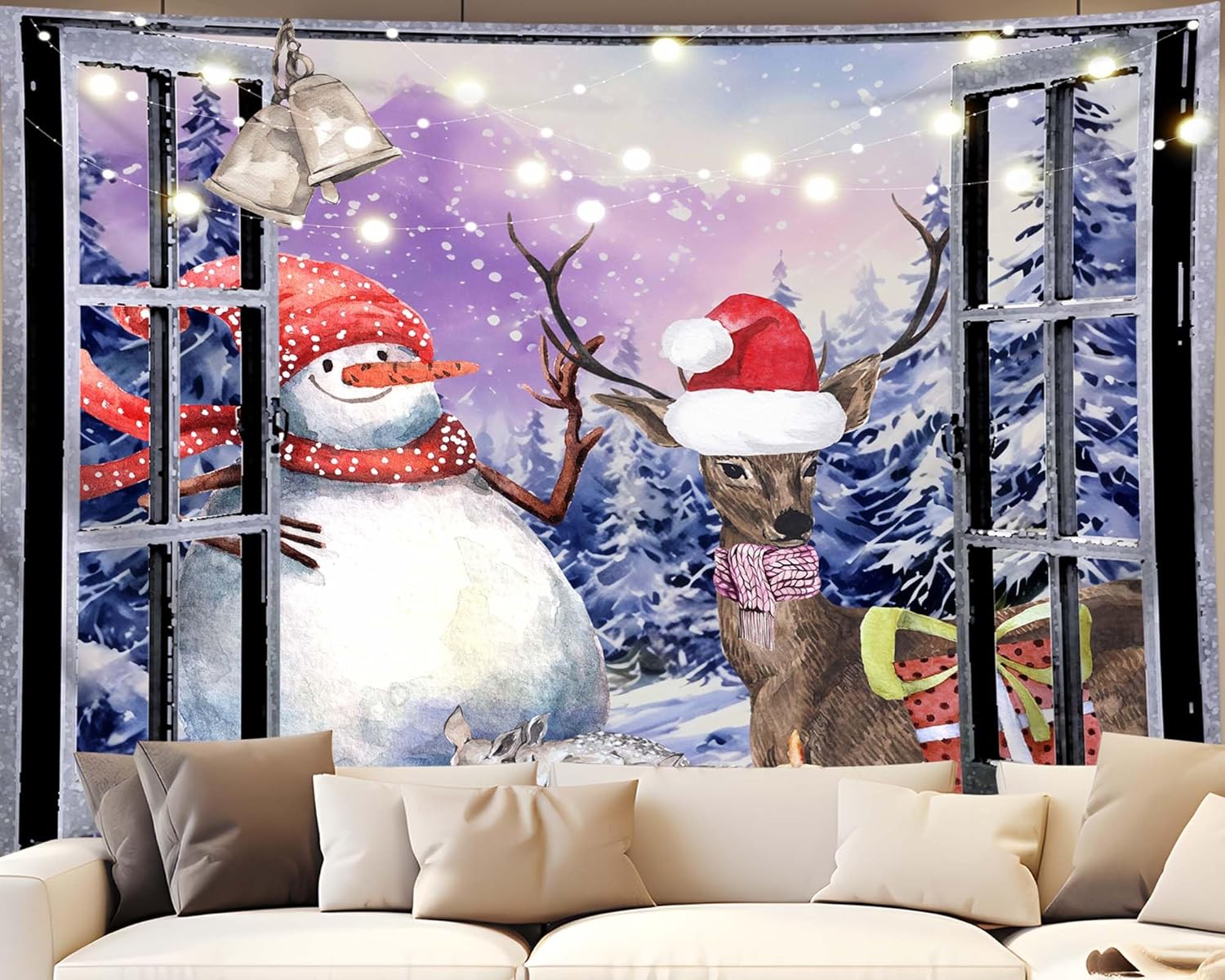 QGHOT Christmas Window Tapestry Wall Hanging Christmas Backdrop Winter Window Wall Decor Xmas Snowman Deer Tapestries for Bedroom Living Room Dorm Holiday Party Decoration