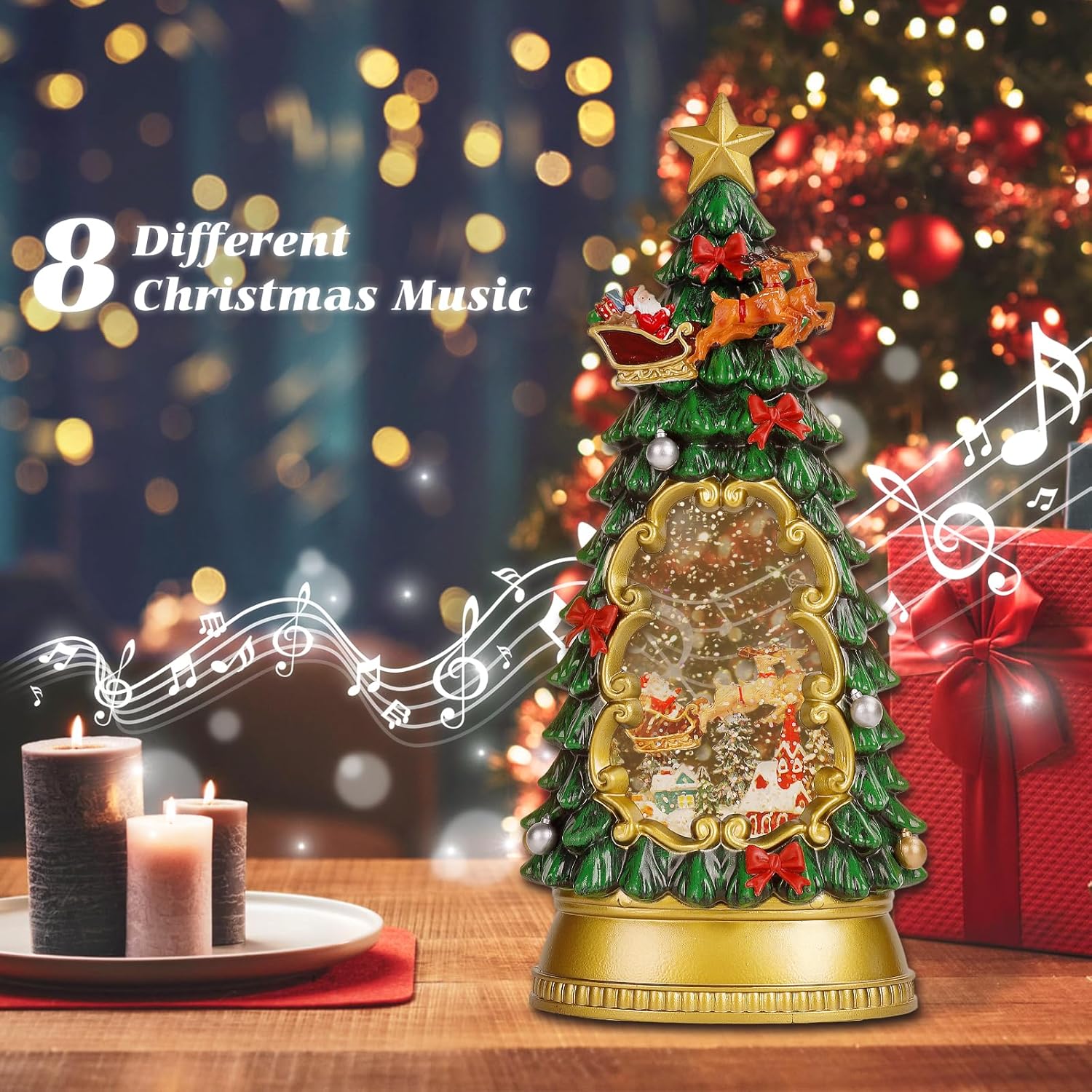 - Christmas Tree:With the Christmas tree as the inspiration design, the tree is hung with Santa Claus driving reindeer, accompanied by rotating snowflake effect, lifelike snowman and Santa Claus glittering inside the snow glboe, creating a festive joy and cozy atmosphere.