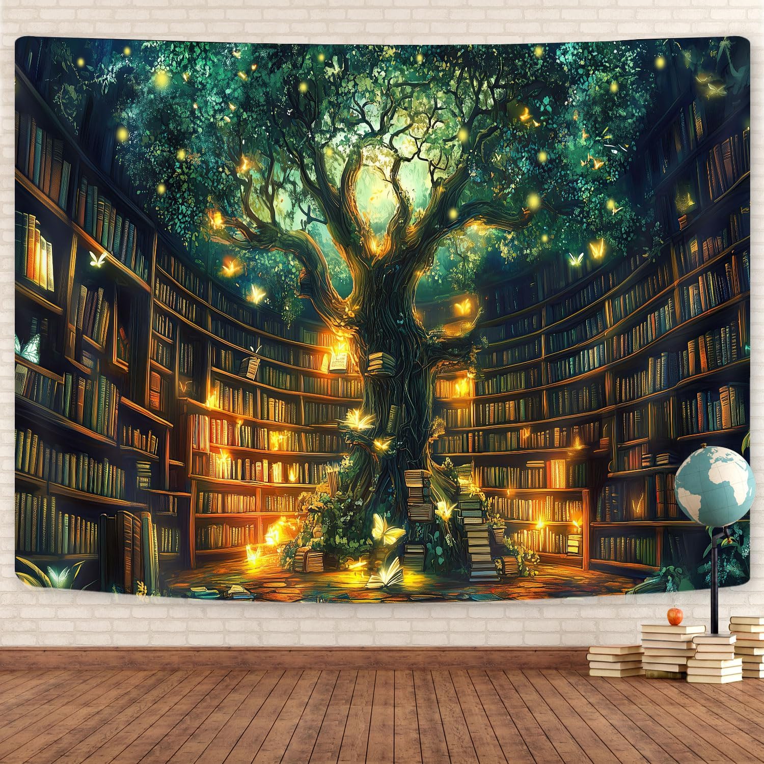 Fantasy Library Tapestry, Fairytale Tree Magic Bookshelf Aesthetic Tapestries for Classroom, Witchy Fairy Tree Mysterious Vintage Bookshelf Book Art Tapestry Wall Hanging College Room Bedroom, 80"X60"