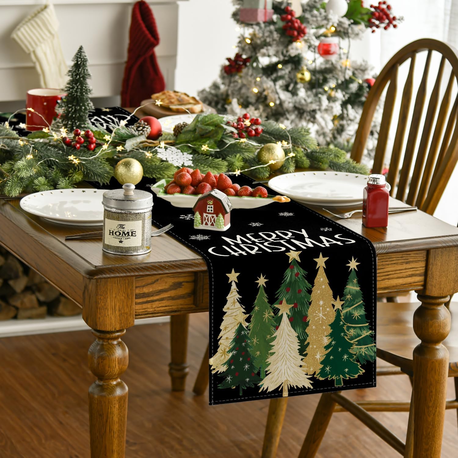 Artoid Mode Xmas Trees Snowflakes Black Merry Christmas Table Runner, Winter Seasonal Kitchen Dining Table Decoration for Home Party Decor 13x90 Inch
