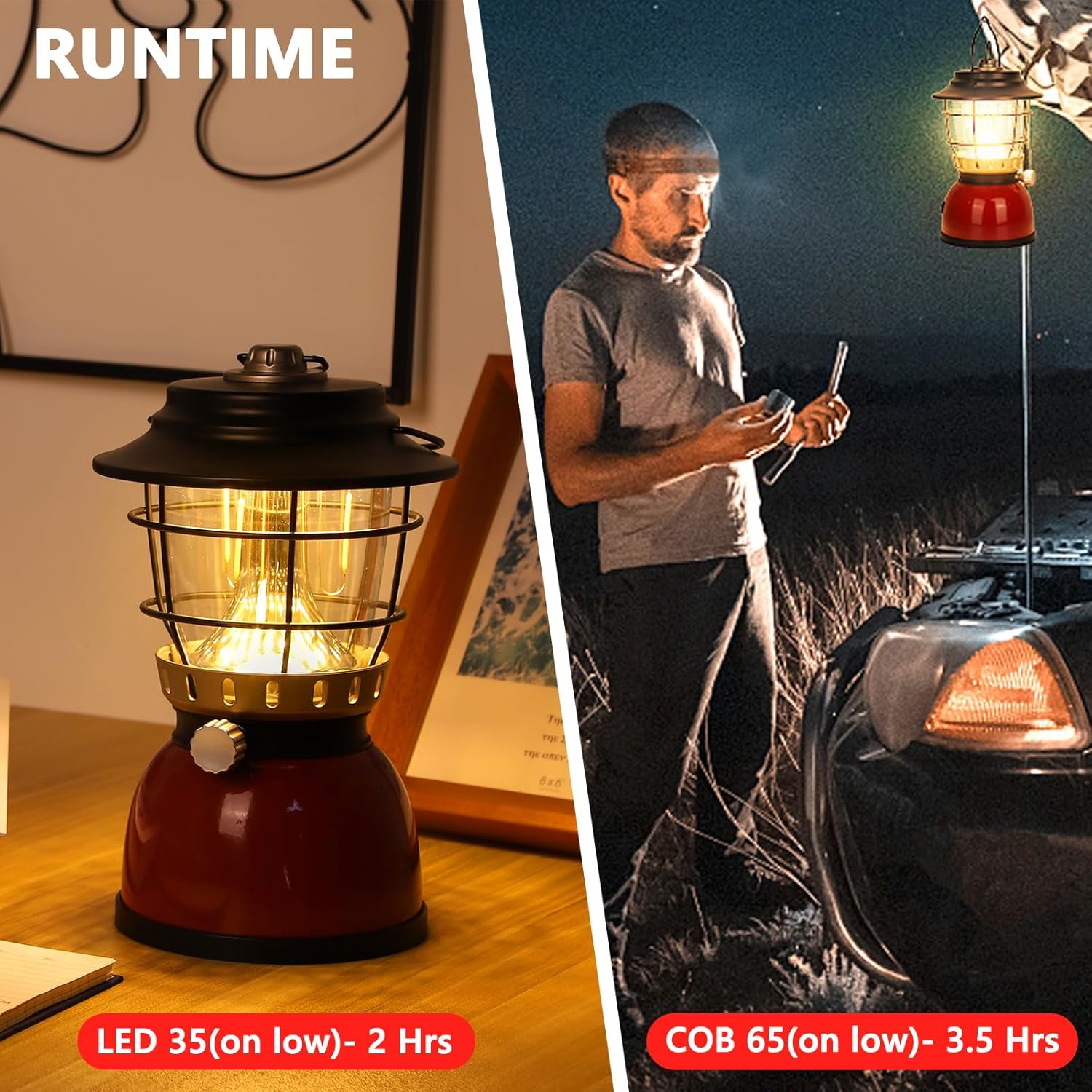 - Long Lasting & Multiple Use: Our camping lantern features energy-efficient LED and COB light that minimizes power consumption, up to 65 hours of continuous illumination on a single full charge. Suitable for various occasions, from camping and hiking to power outages and emergencies, this lantern adapts to your needs. Its multi-mode functionality ensures you have the right light setting for any situation, making it an essential tool for every outdoor enthusiast and emergency kit.