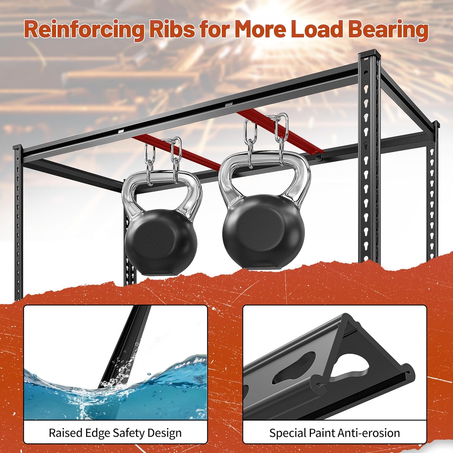 - 【2550LBS Capacity Garage Shelving】This garage shelving is made of heavy duty metal. The rolled edge thickened column effectively protects your hands, and the thickened design makes the load-bearing better, ensuring the single-layer load-bearing capacity of the garage shelf 637LBS and the total load-bearing capacity of 2550LBS. It is suitable for garage, workplaces, warehouse, living room, kitchen, to store camping equipment, tools, kitchen supplies