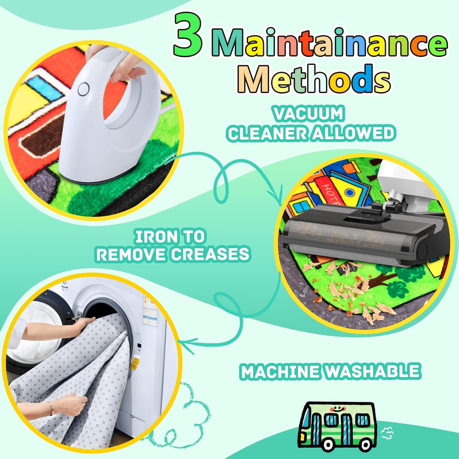 - [Machine Washable Kids Play Rug]: This car rug for kids toy cars measures 5 x 7 feet/60*79 inches. 0.4'' thick. Our mat is easy to clean by vacuum or machine. Perfect bedroom rug, living room rug, and playroom rug.