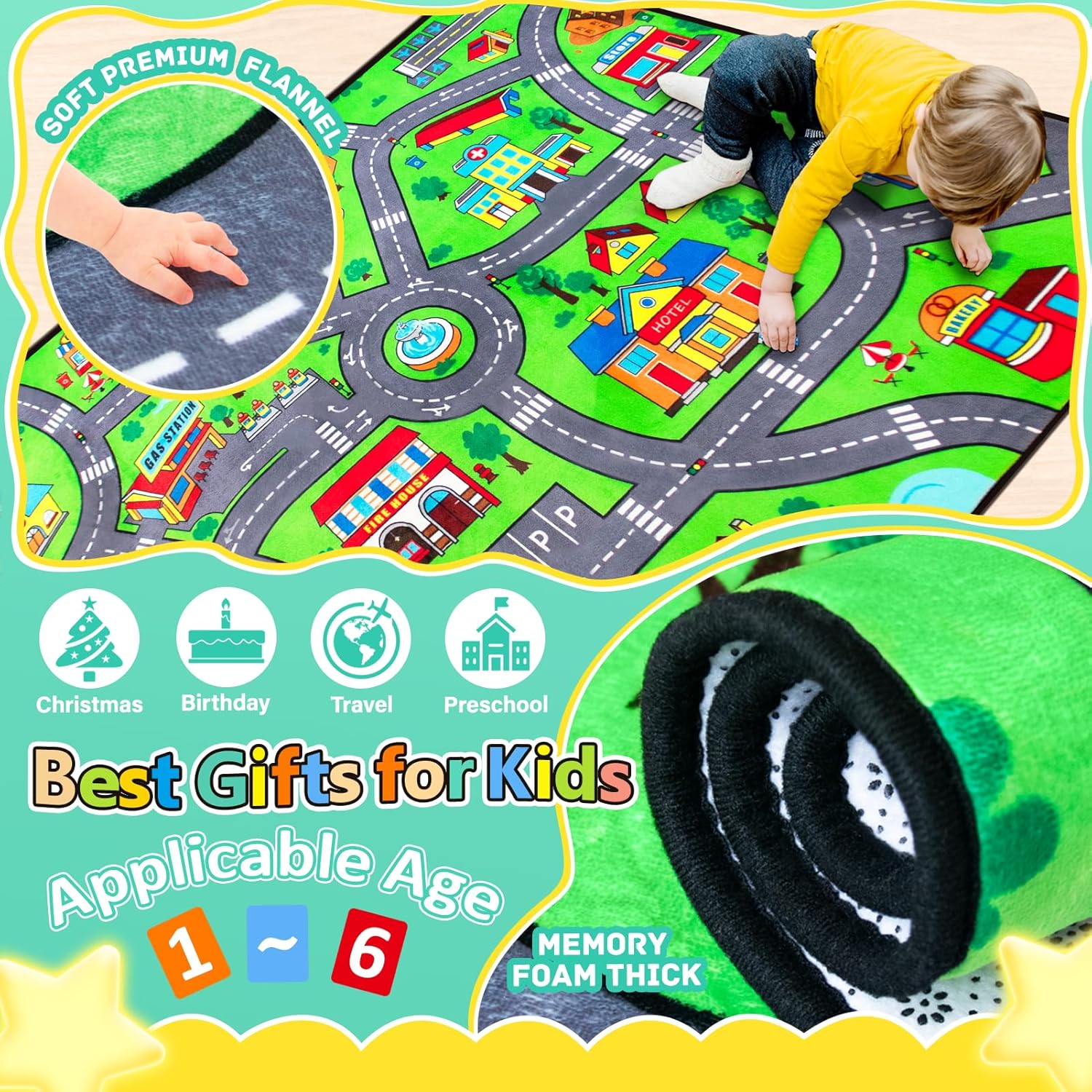 - [Upgraded Material]: Our kids playmat rug is made of premium flannel, and high-resilience sponge, equipped with non-slip backing. The road rug for kids is designed to provide extra cushioning and comfort, protecting babies from bumps and knocks while crawling.