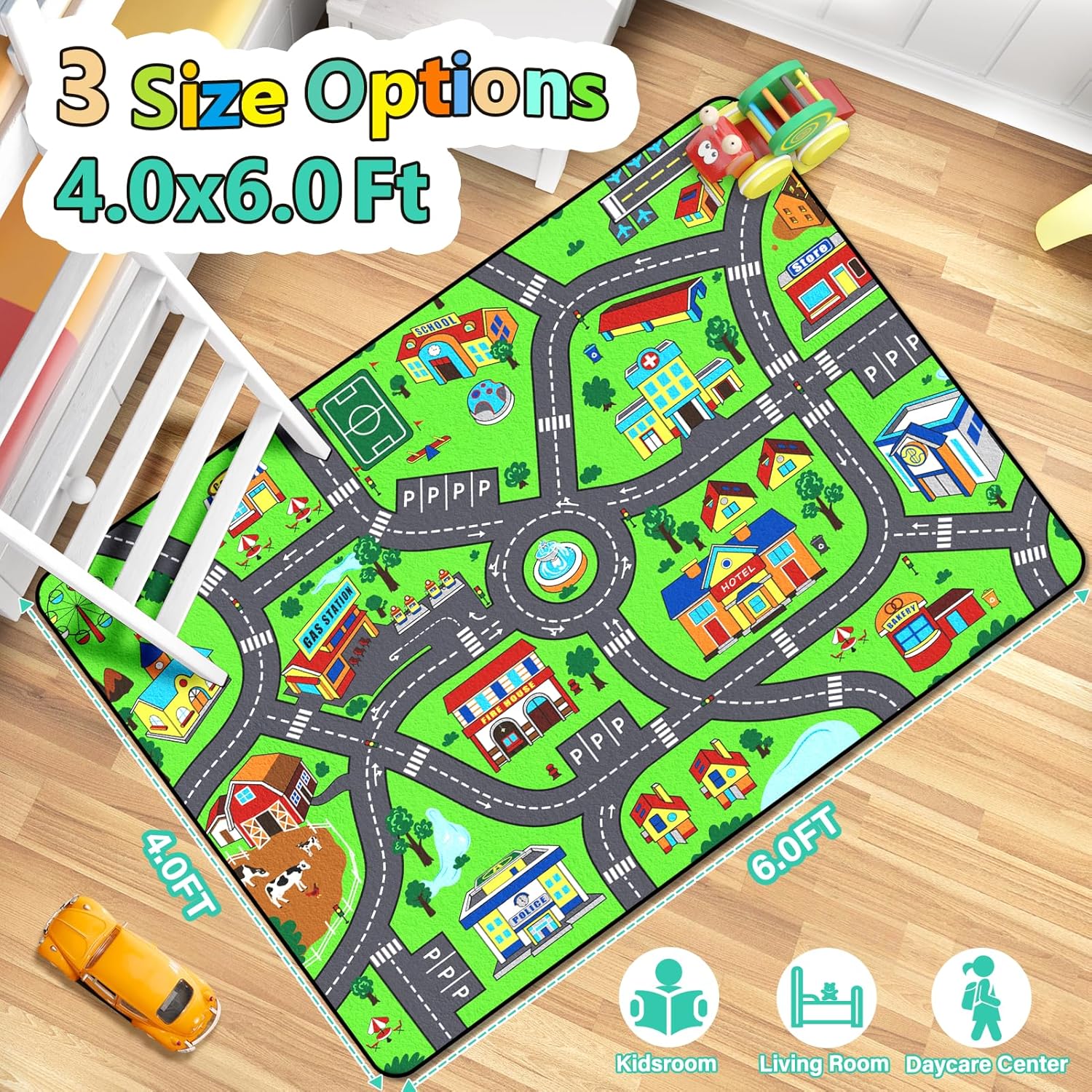 - [Machine Washable Kids Play Rug]: This car rug for kids toy cars measures 4 x 6 feet/48*72 inches. 0.4'' thick. Our mat is easy to clean by vacuum or machine. Perfect bedroom rug, living room rug, and playroom rug.