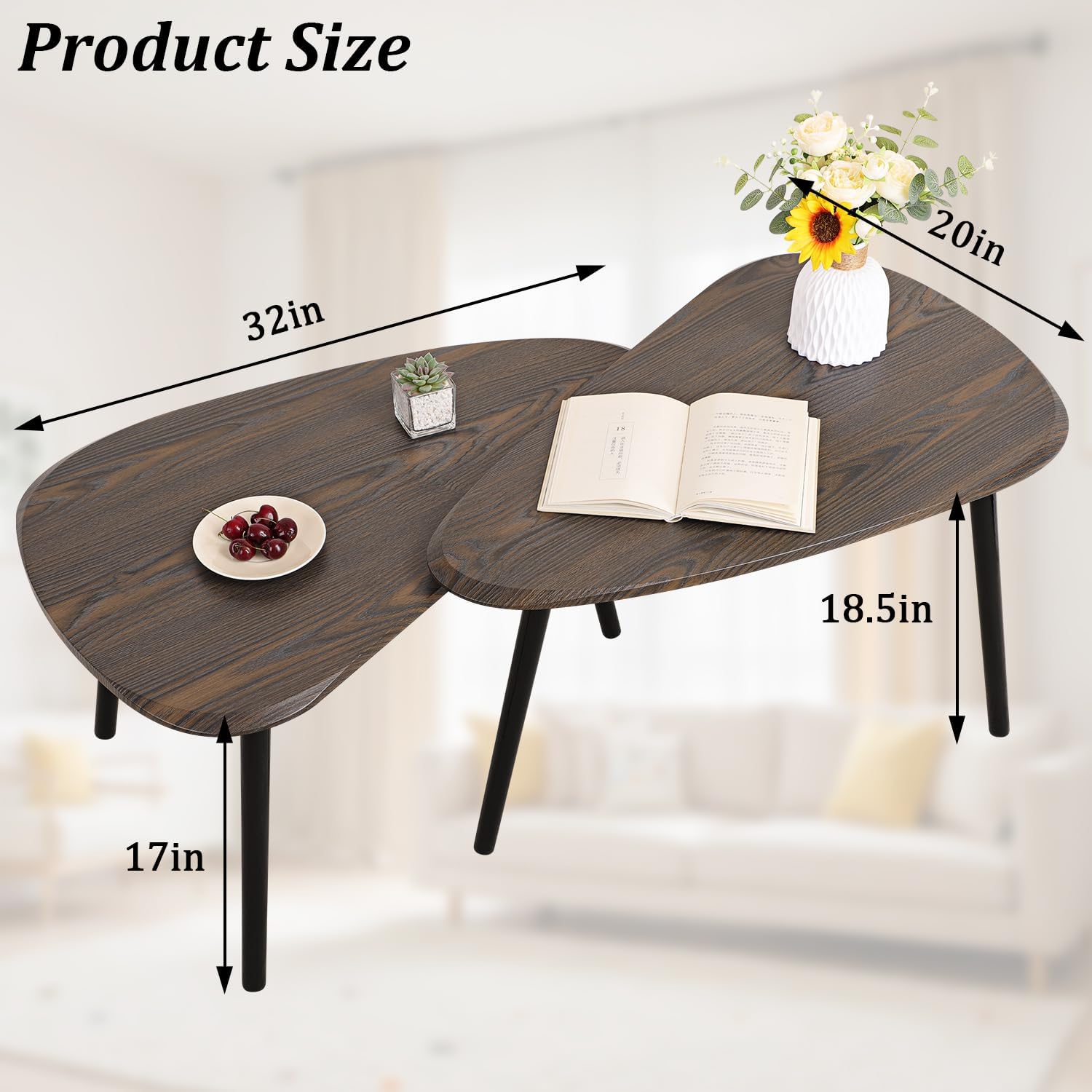 Nesting Coffee Table Set of 2 Side Set Wooden Tables Living Room Bedroom Apartment Modern Industrial Simple Nightstand,Walnut 32" D x 20" W x 18.5" H