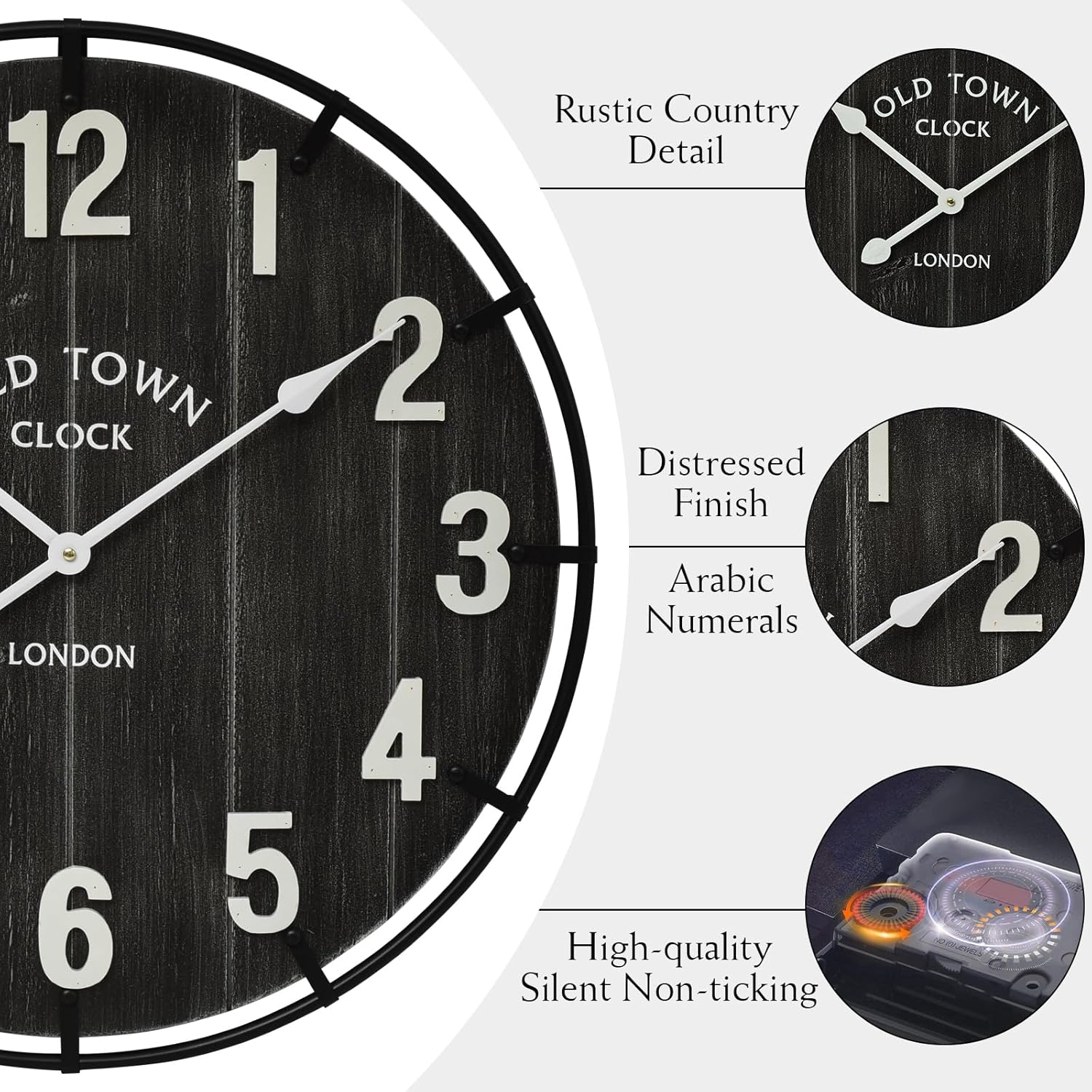 Large Old Town Farmhouse Wall Clock – 24 Inches Rustic Antique Wood with Metal Circle and Large Numerals, Silent Battery Operated Clock for Office, Kitchen, Bedroom, Living Room (Black)
