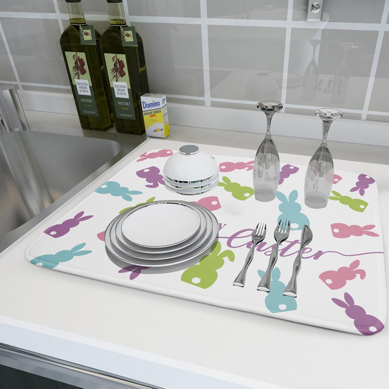 Easter Dish Drying Mat for Kitchen Counter Colorful Bunny Rabbit Festival Holiday Seasonal Absorbent Reversible Microfiber Kitchen Countertop Protector Dishes Pad Large 18x24 inch